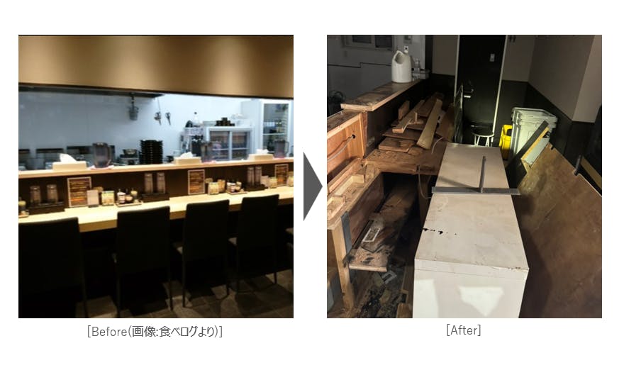 類焼により、消火活動で被った水漏れや煙による異臭で営業再開の目途は立っておりません。