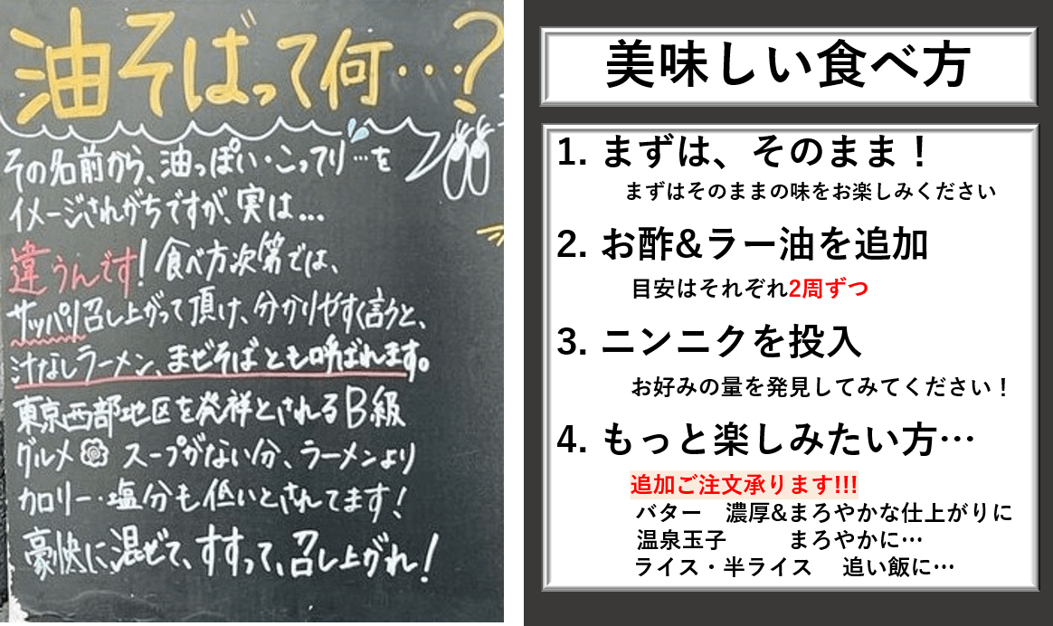テイクアウトした油そばの作り方や食べ方は、当店のYoutubeチャンネルに常連客が作成した動画をアップしていますのでご覧ください。