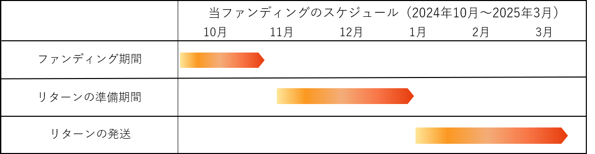 ※ただし、リターンのお品物は準備ができ次第発送しますので、スケジュールより早まる場合がございます