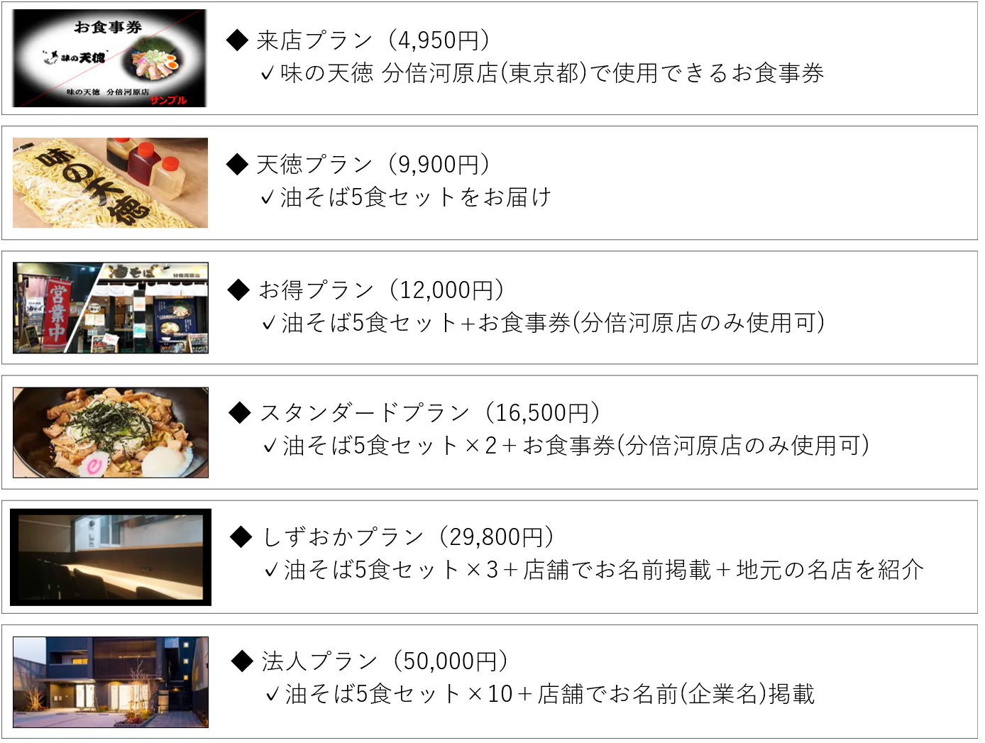 「味の天徳 油そば5食セット」を中心に、当店の系列店である「味の天徳 分倍河原店(東京都)」にて使用できるお食事券などをお渡しします。