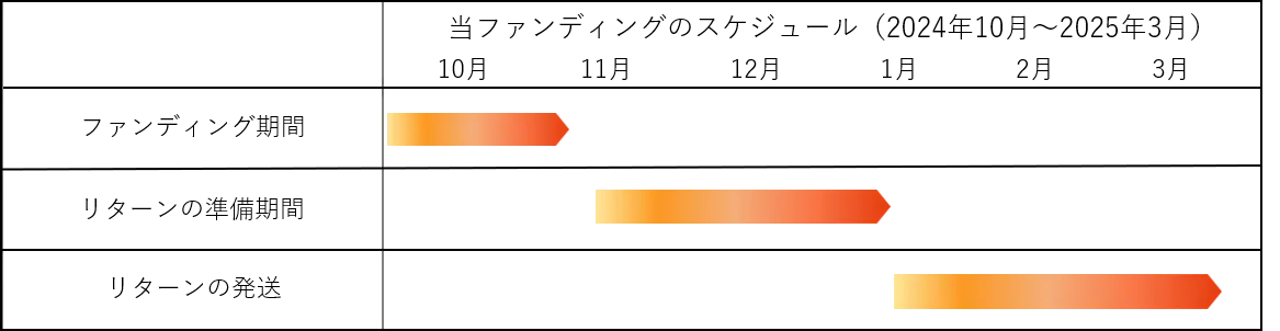 ※ただし、リターンのお品物は準備ができ次第発送しますので、スケジュールより早まる場合がございます