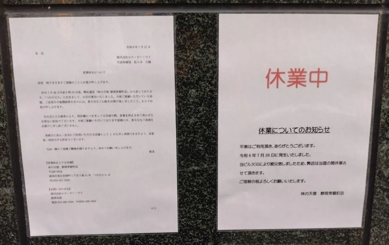 類焼により、消火活動で被った水漏れや煙による異臭で営業再開の目途は立っておりません。