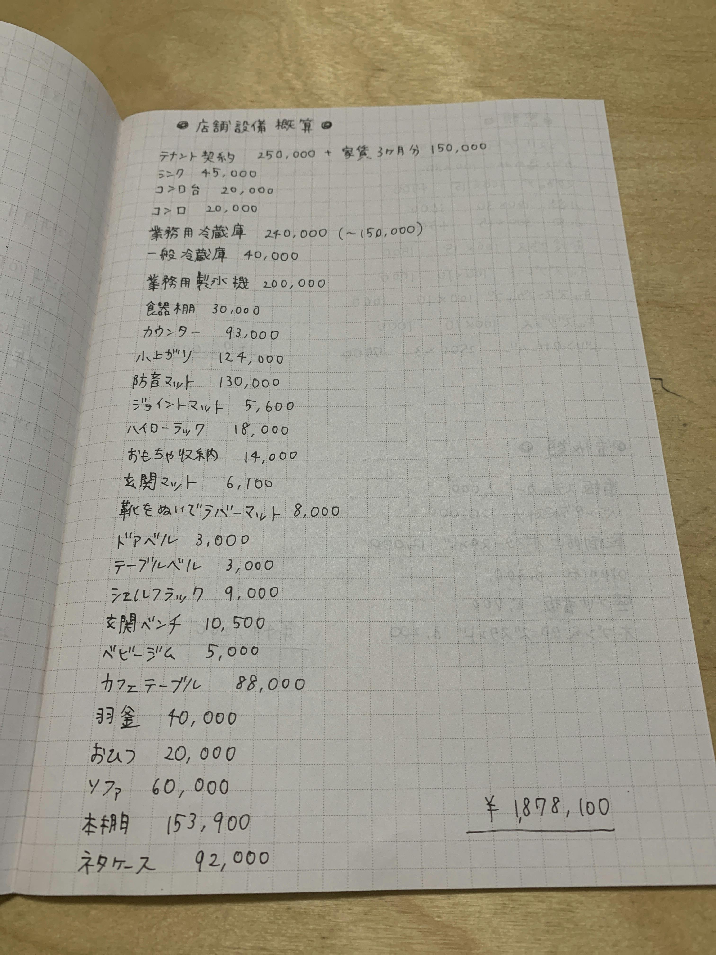 2024/08/27 22:16ざっくり頭の中で計算していたのを書き出し、店舗設備にかかる概算を出しました。多めに見積もったり、必要がないかもしれないものも入ってたり、反対に細々したものが多分抜けてたりするので、あくまで概算ですが……(写真に載せてない別項目に器類、看板類、その他メニュー表作成にかかる写真撮影代なんかもあります)これであと、リフォーム工事にいくらかかるか、当面の仕入れ費用がいくらぐらいか……おむすび等の原価計算はまだちまちま食材を取り寄せてるので(ある程度揃ってから食べ比べするため)、まだもう少し先に。カフェ実現に向けて、少しずつやっていきたいと思います⤴ もっと見る