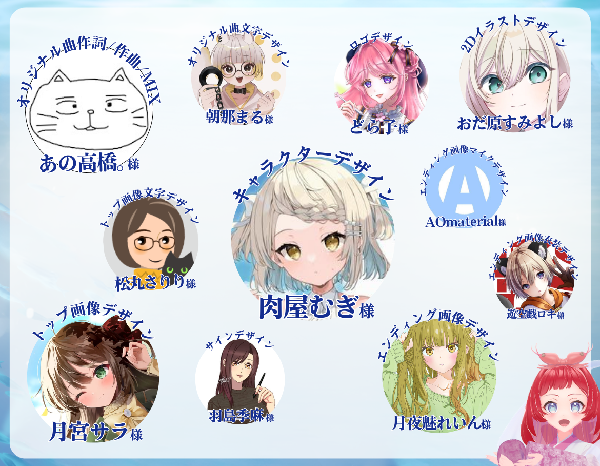 肉屋むぎ様◆potofu 月宮サラ様◆HP あの高橋。様◆ココナラ 朝那まる様◆lit.link おだ原すみよし様◆X 松丸さりり様◆X どら子様◆Xfolio 羽島季麻様◆ココナラ 月夜魅れいん様◆lit.link AOmaterial様◆X 遊空戯ロキ様◆X