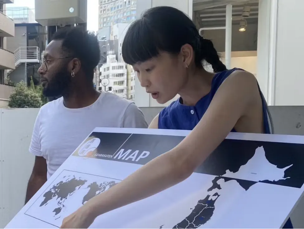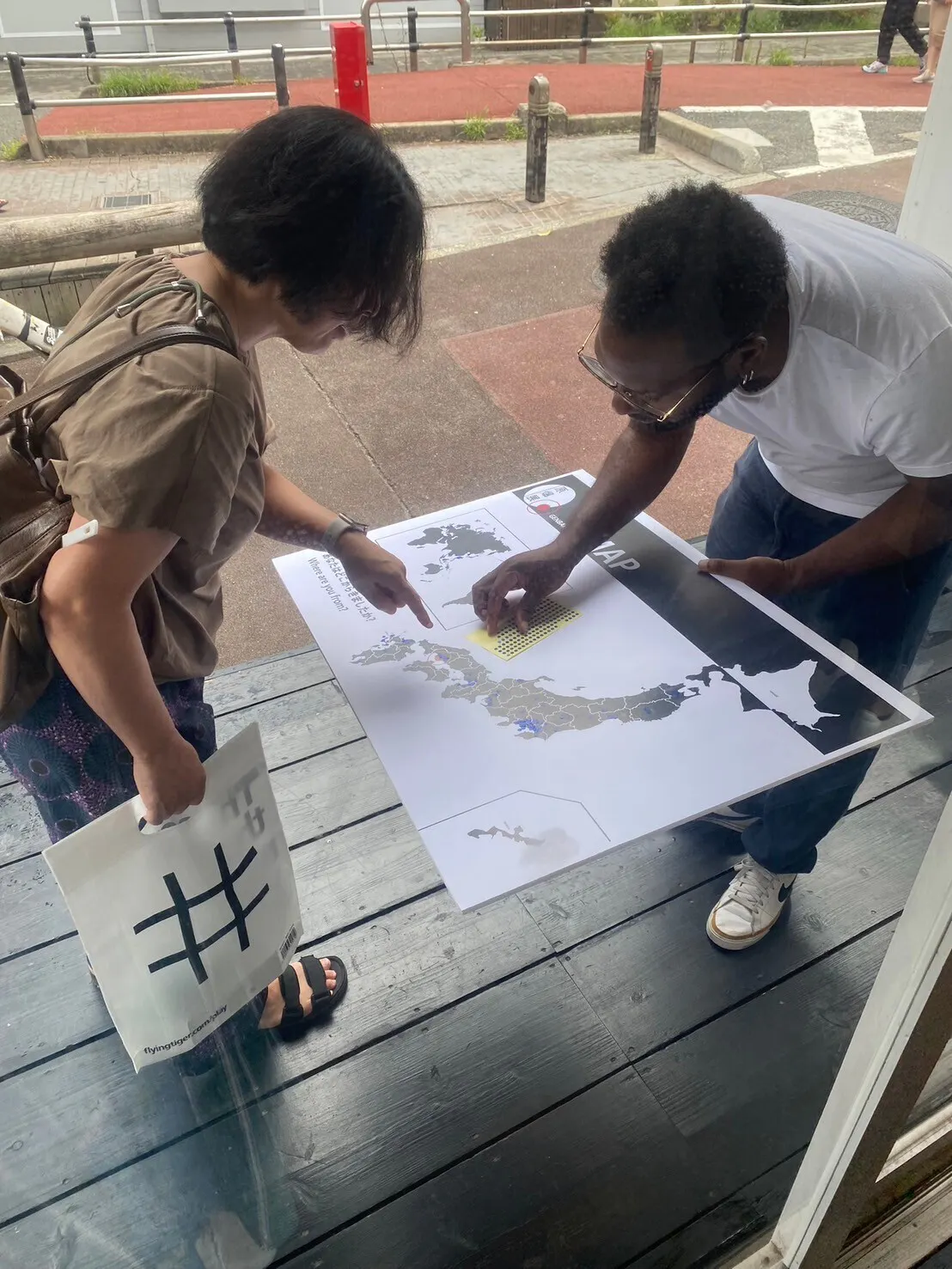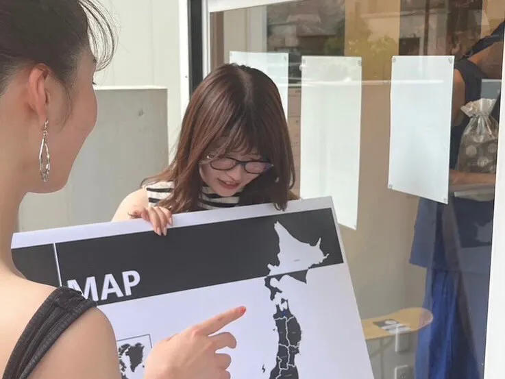 大きな日本と、小さな世界地図が書かれたA1用紙をギャラリーに置き、来場者の出身地や育った場所にシールを貼っていただきます。