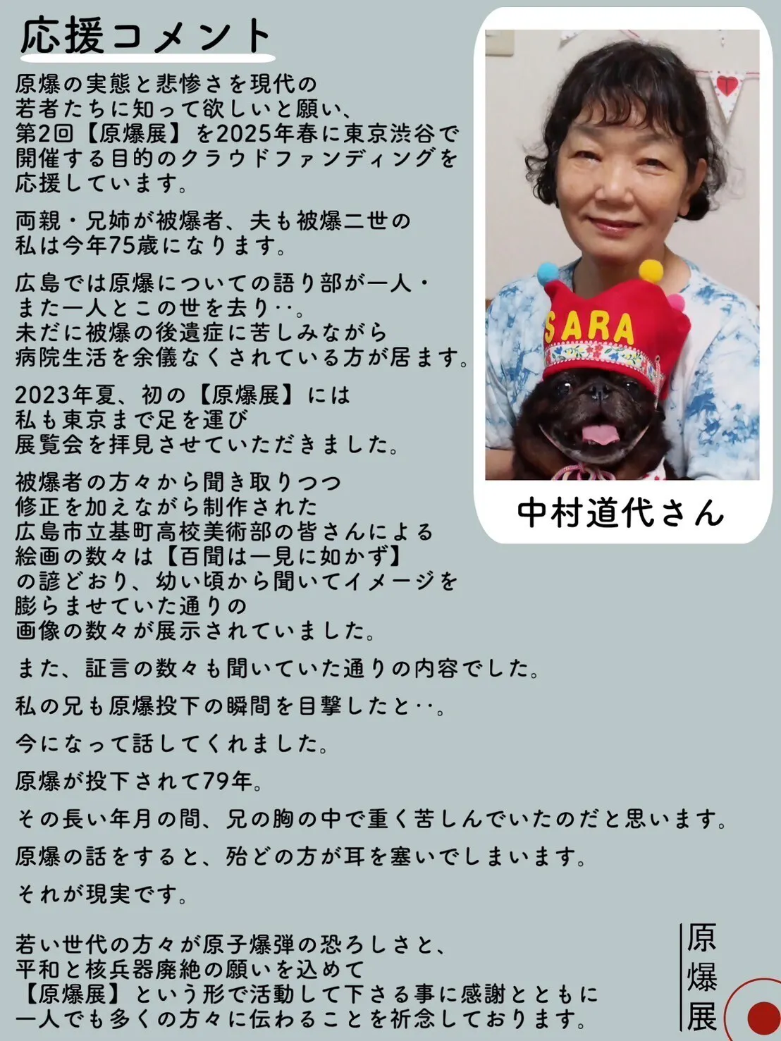 ●50,000円のご支援→感謝のメール・活動報告書・ホームページに名前を記載・原爆展2025年度版冊子1冊