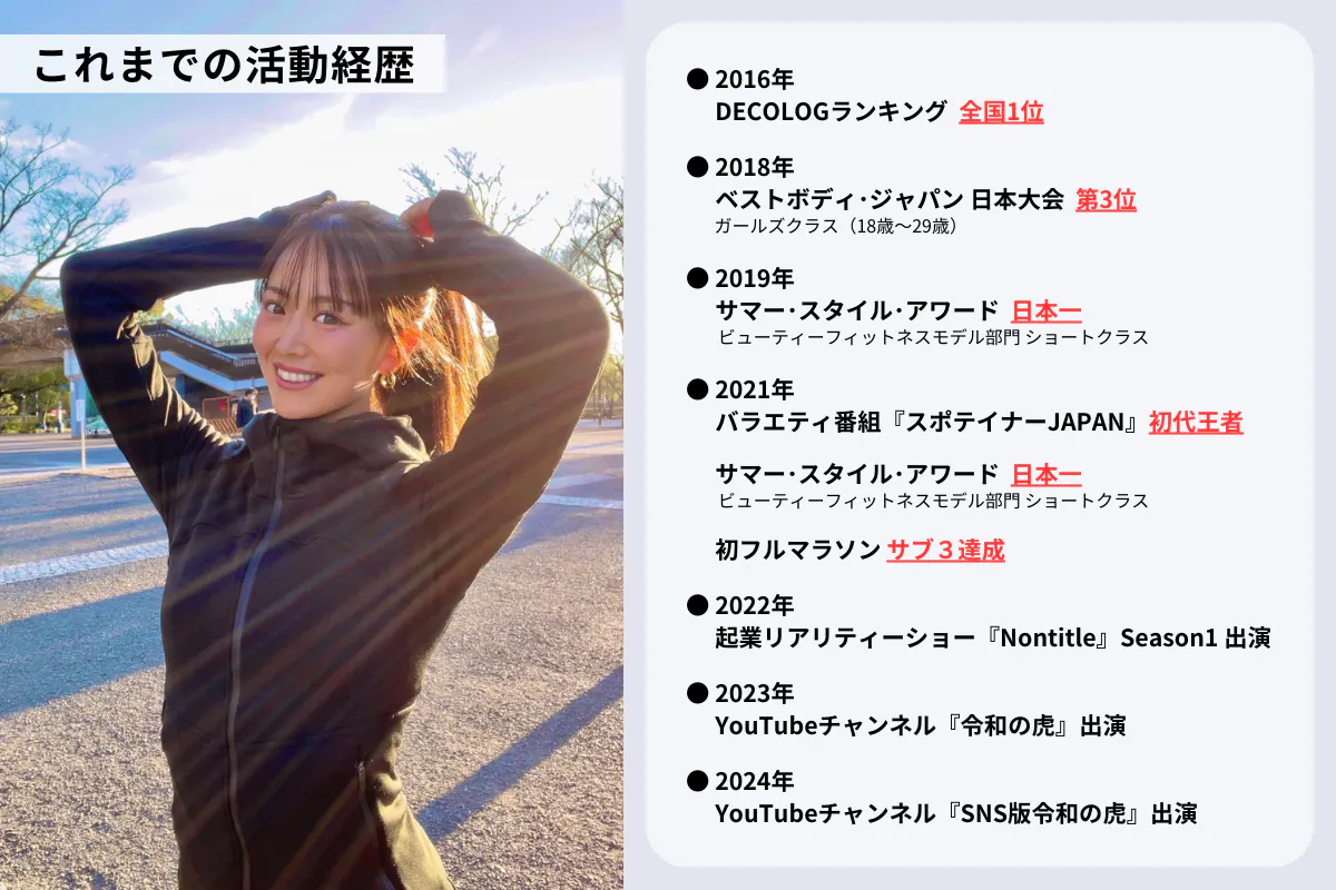 ダイエットによって心も身体もどんどんボロボロになっていく中、2018年から本格的に始めたのが「筋トレ」です。浮気されて別れることになった彼を見返したいと筋トレにのめり込み、2018年のボディコンテスト『BEST BODY JAPAN』では、地方予選でグランプリ、日本大会でガールズクラス3位という成績を記録。翌2019年には、 夏の似合う男性・女性を決める大会『SUMMER STYLE AWARD』のビューティーフィットネスモデルショート部門で日本一を獲得しました。