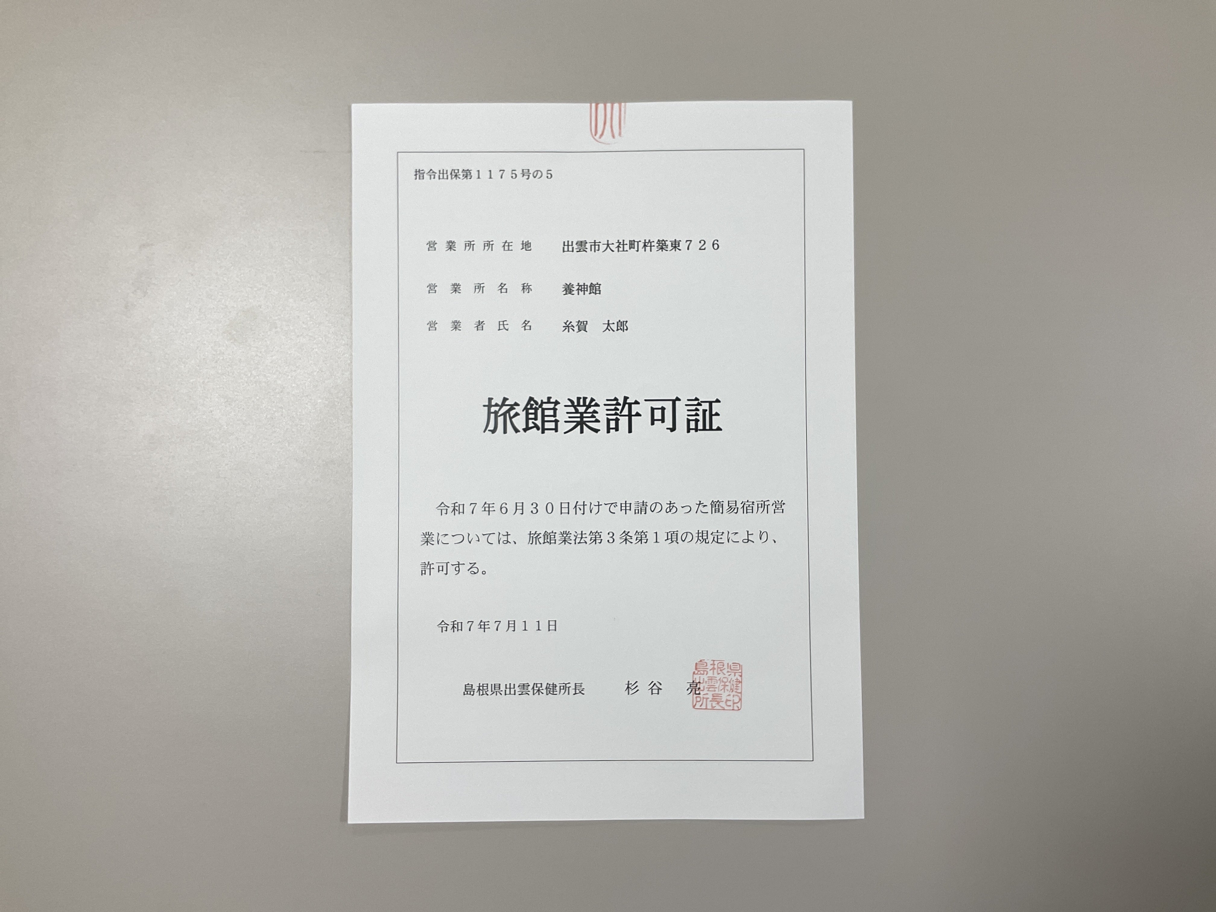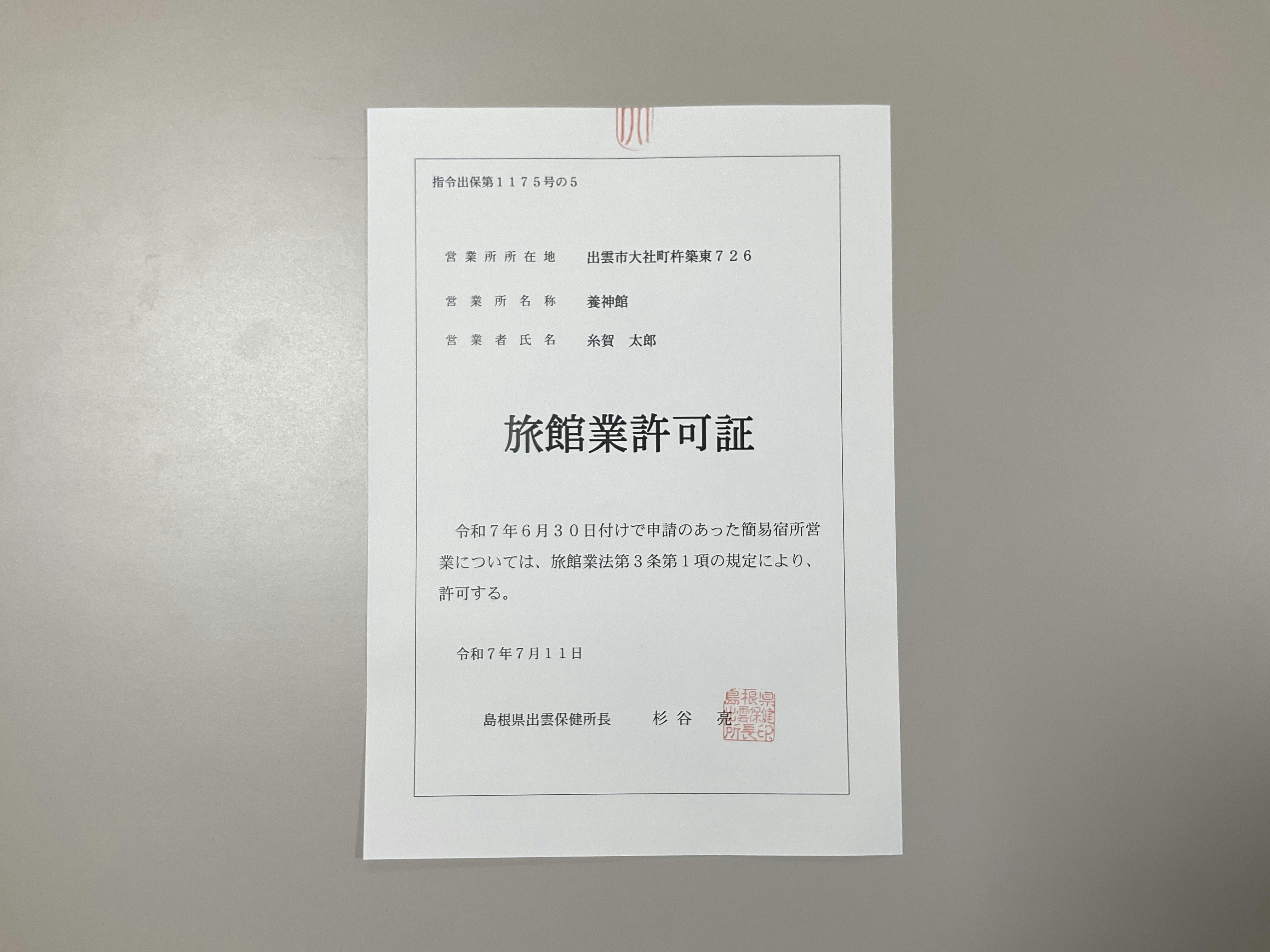 2025/07/15 12:25ご支援いただいた皆さまへ皆さまからのご支援のおかげで、このたび無事に旅館業の許可を取得することができました。当初の予定より少し遅れてしまいましたが、なんとか今月末には営業を開始できそうです。ここまで来られたのは、あたたかいご支援と応援のおかげです。本当にありがとうございます。返礼品についても、準備が整ったものから順次発送を開始いたしますので、もうしばらくお待ちください。引き続き、温かく見守っていただけますと幸いです。今後ともどうぞよろしくお願いいたします。 もっと見る