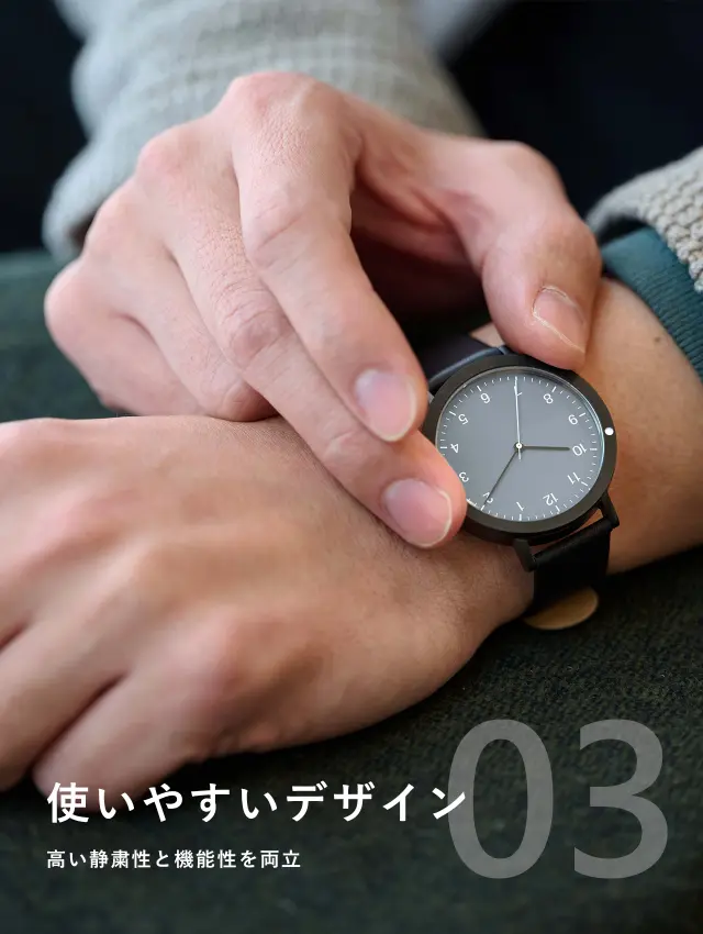 針は極限まで細くし、時刻の目盛や数字も大きくなり過ぎないよう、ゆとりを感じる余白を意識したデザインを心掛けました。