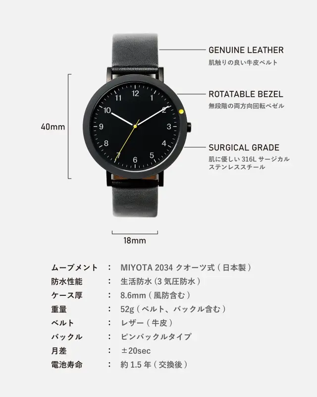 時間が見やすく分かりやすい40mmサイズの文字盤を採用。