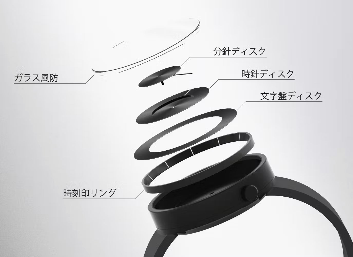3層の円盤を立体的に配置することで時刻を表示する、新しいデザインを生み出しました。