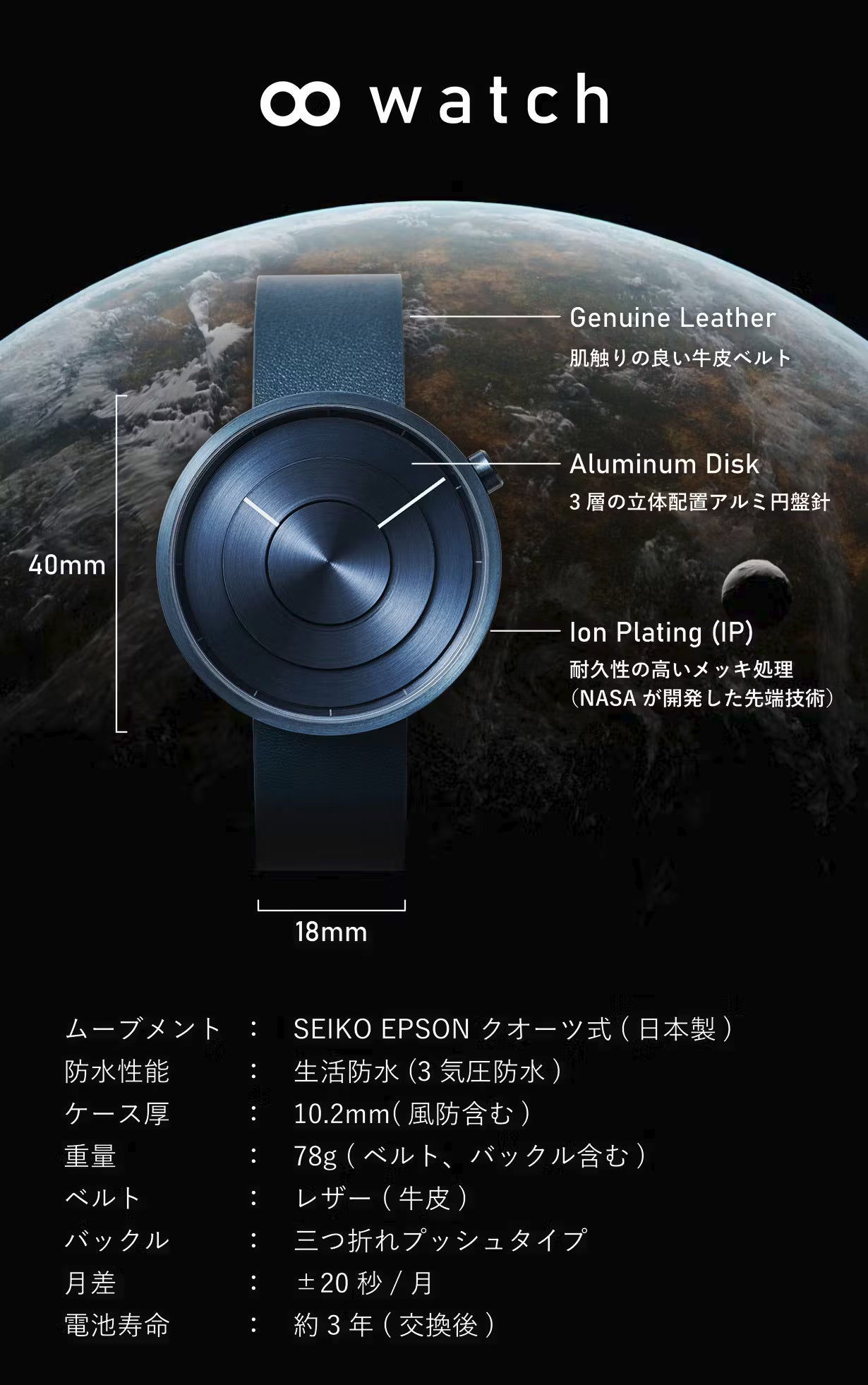 宇宙をテーマにした【oo watch】は、本体だけでなく文字盤やベルト、裏蓋からネジ1本まで徹底的にデザインして作り込みました。