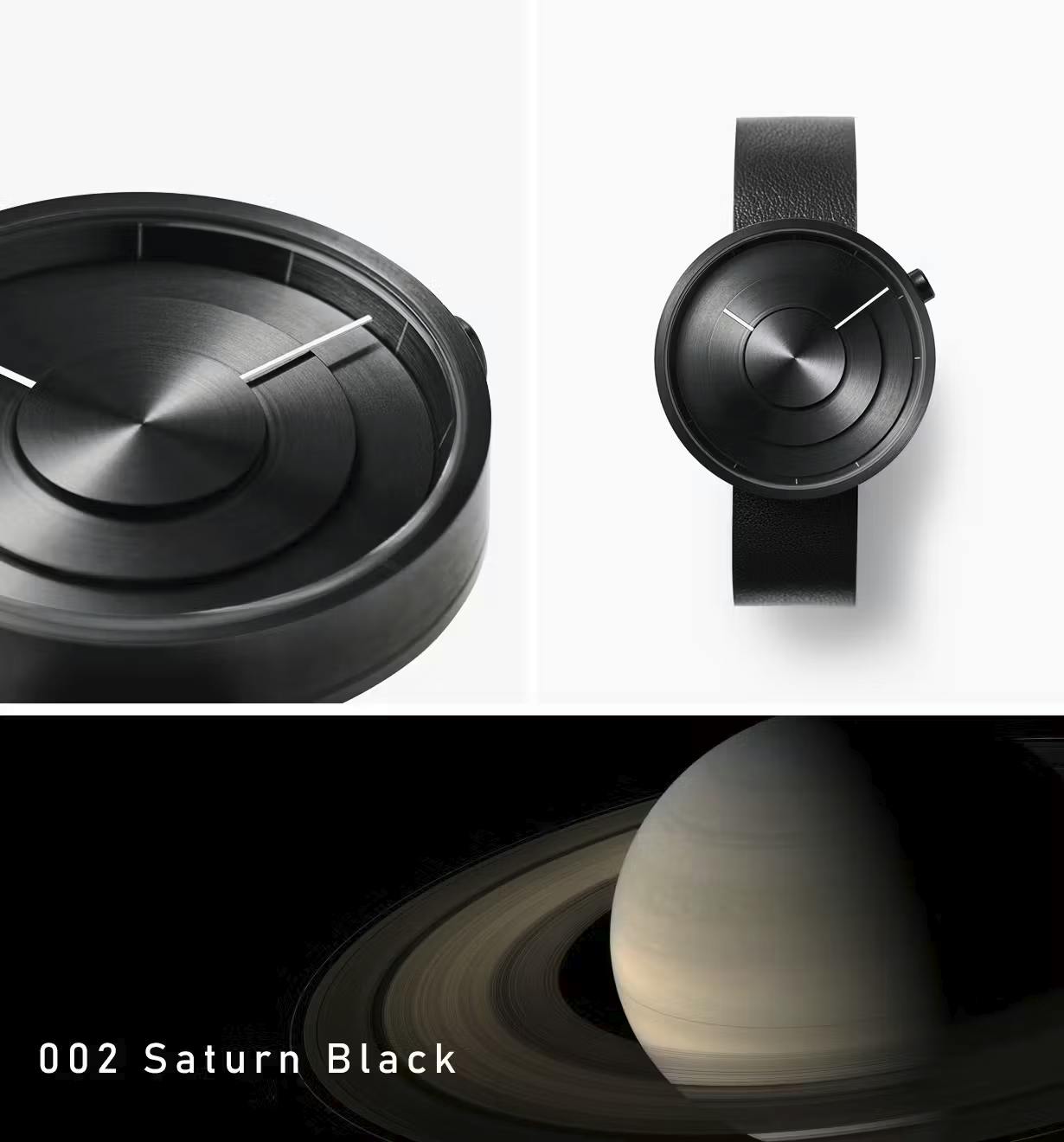 【oo watch】は宇宙からインスピレーションを受けた腕時計です。星の公転運動や惑星リングから着想を得た、特徴的な3層の円盤システムにより時刻を表示します。