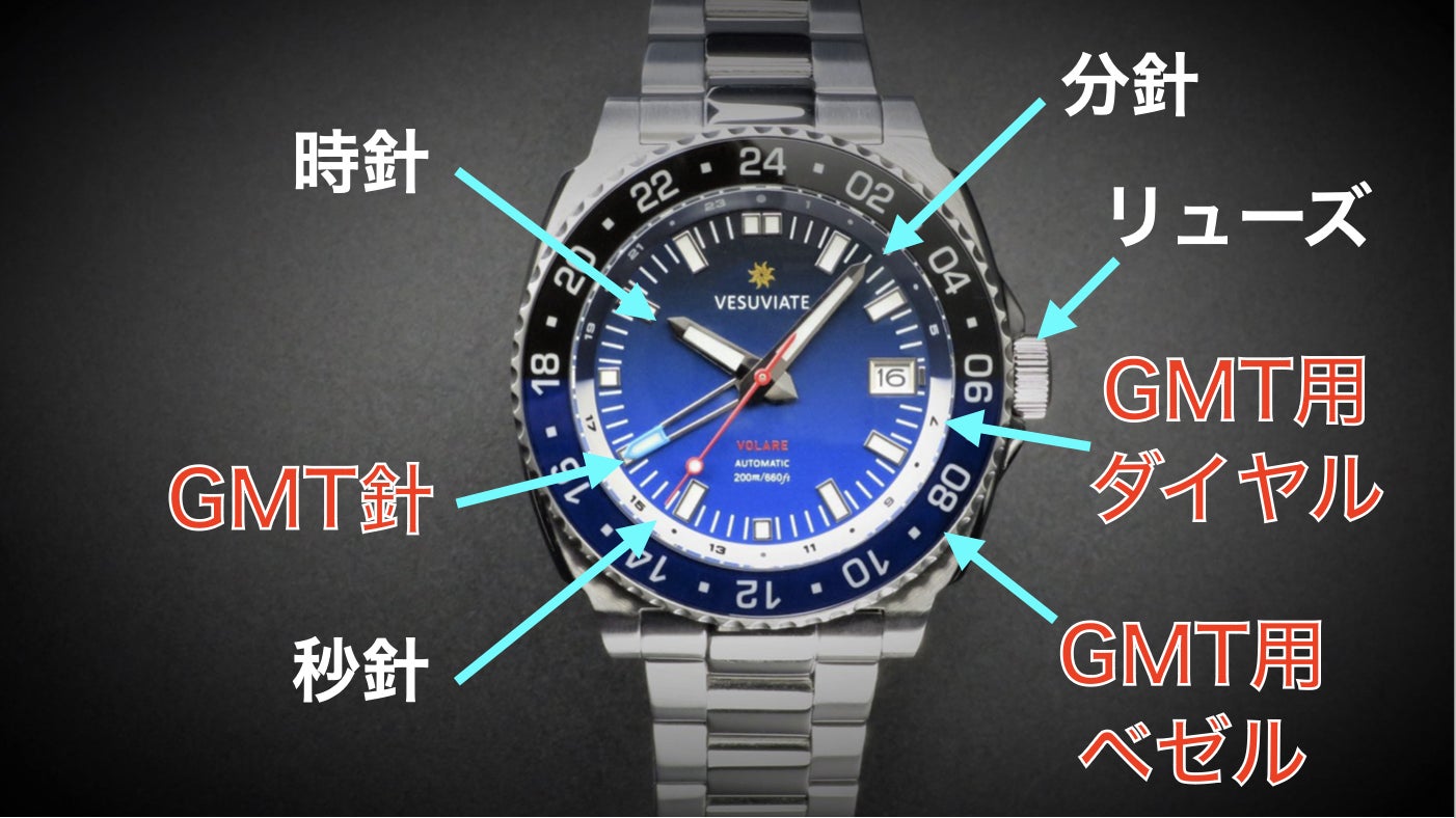 その時差を24時間で一周するGMT針で表示するので、一目でタイムゾーンの違う地域の時間がわかります。
