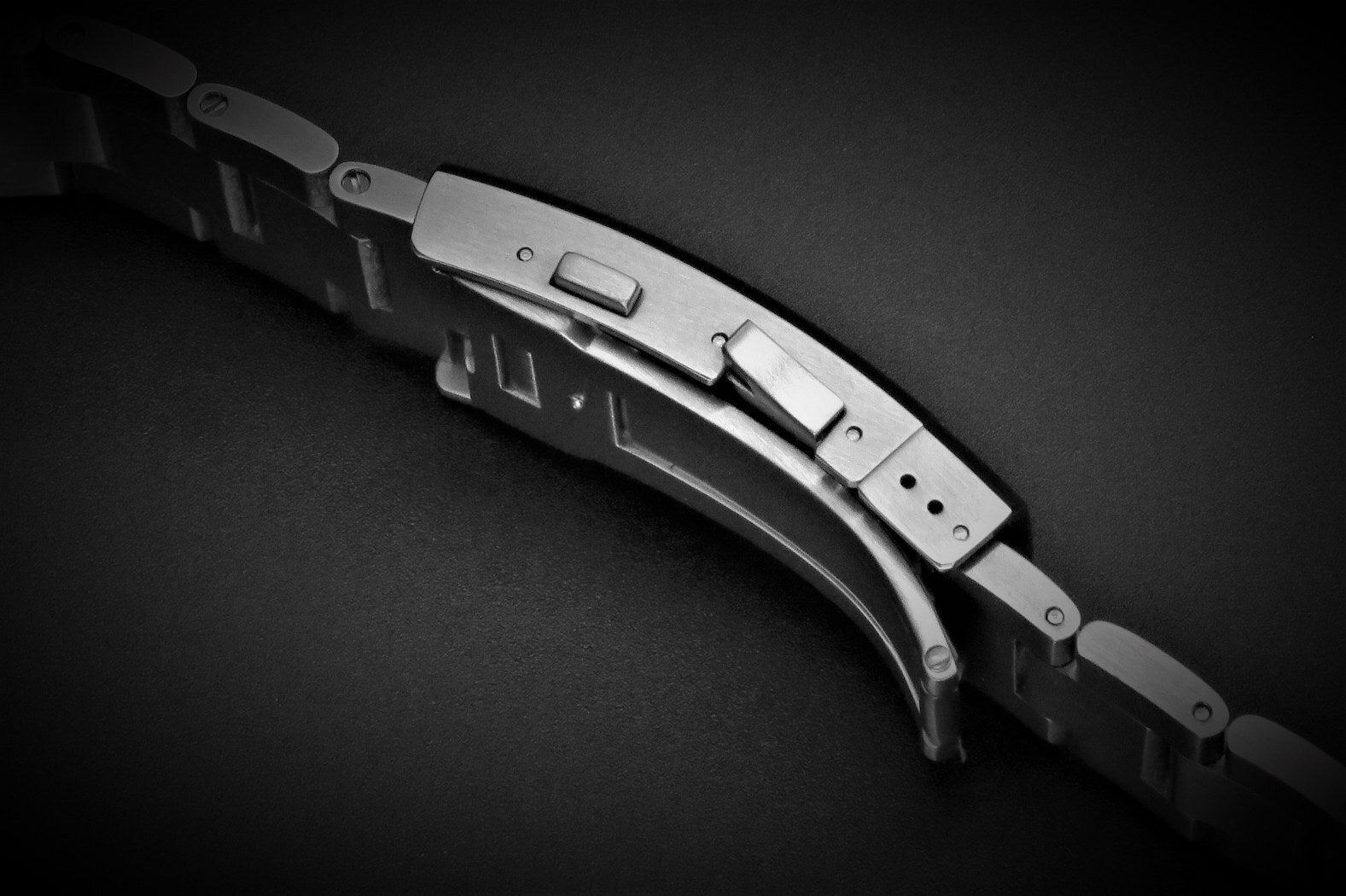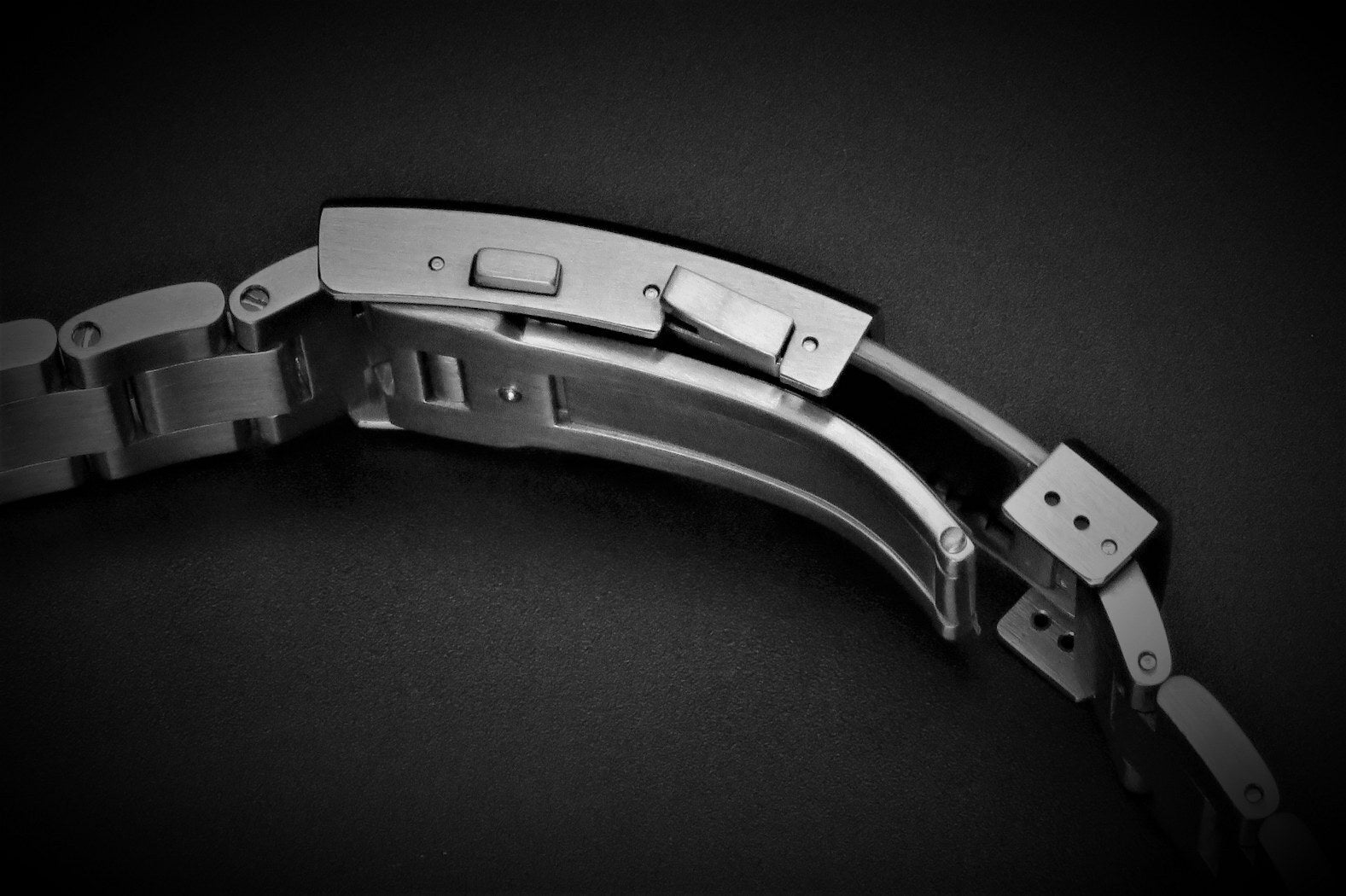 真ん中のコマは光沢仕上げ、両サイドのコマは艶消し(ヘアライン)仕上げとなっています。ブレスレットには調整可能な折りたたみ式プッシュボタン展開クラスプと、エクステンション用のスライドバーが装備されています。