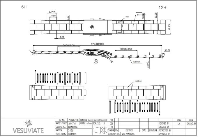 ブレスレットの寸法 – 20mm~18mm、フォールディングクラスプ付き、微調整とラチェットエクステンション付き。すべての部品は、表面硬化処理されたSUS 316Lです。