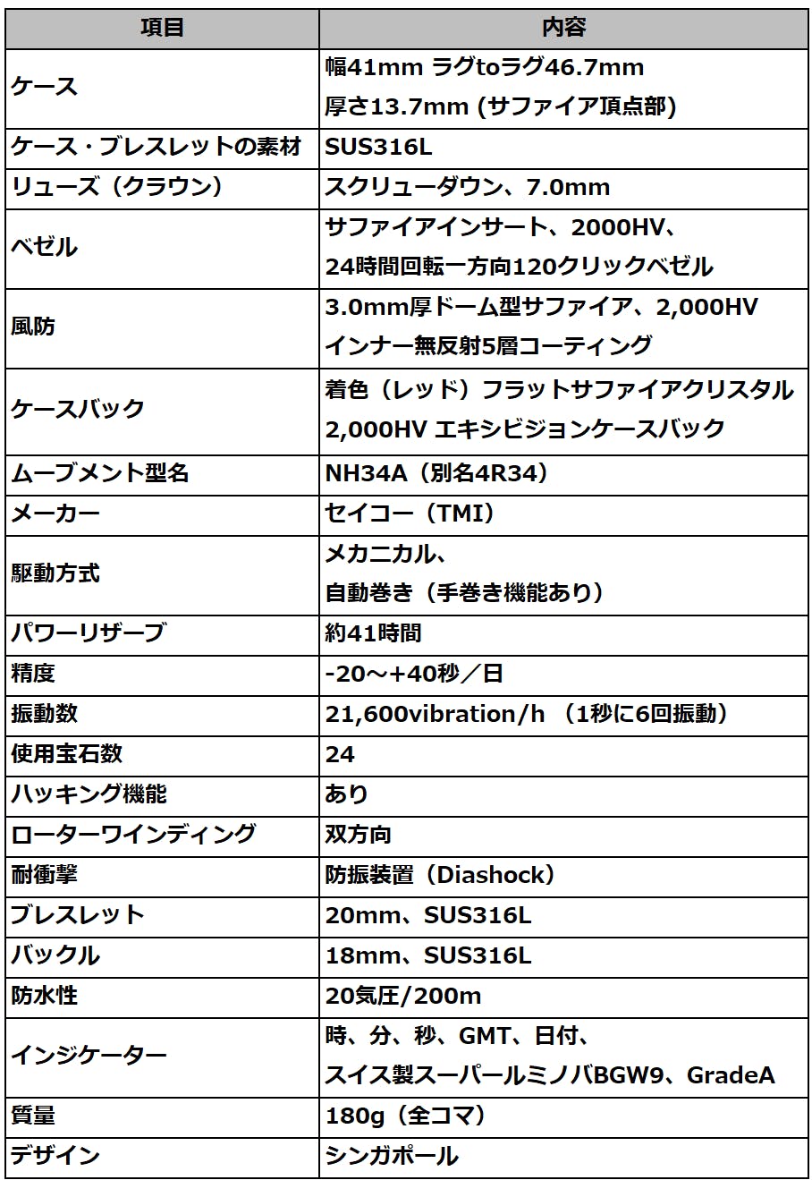 ※ただし、ベゼルはGMT用の24時間表示になっているので、ダイブコンピュータと併用することが必要です。腕時計はバックアップまたはファッションとして使用してください。