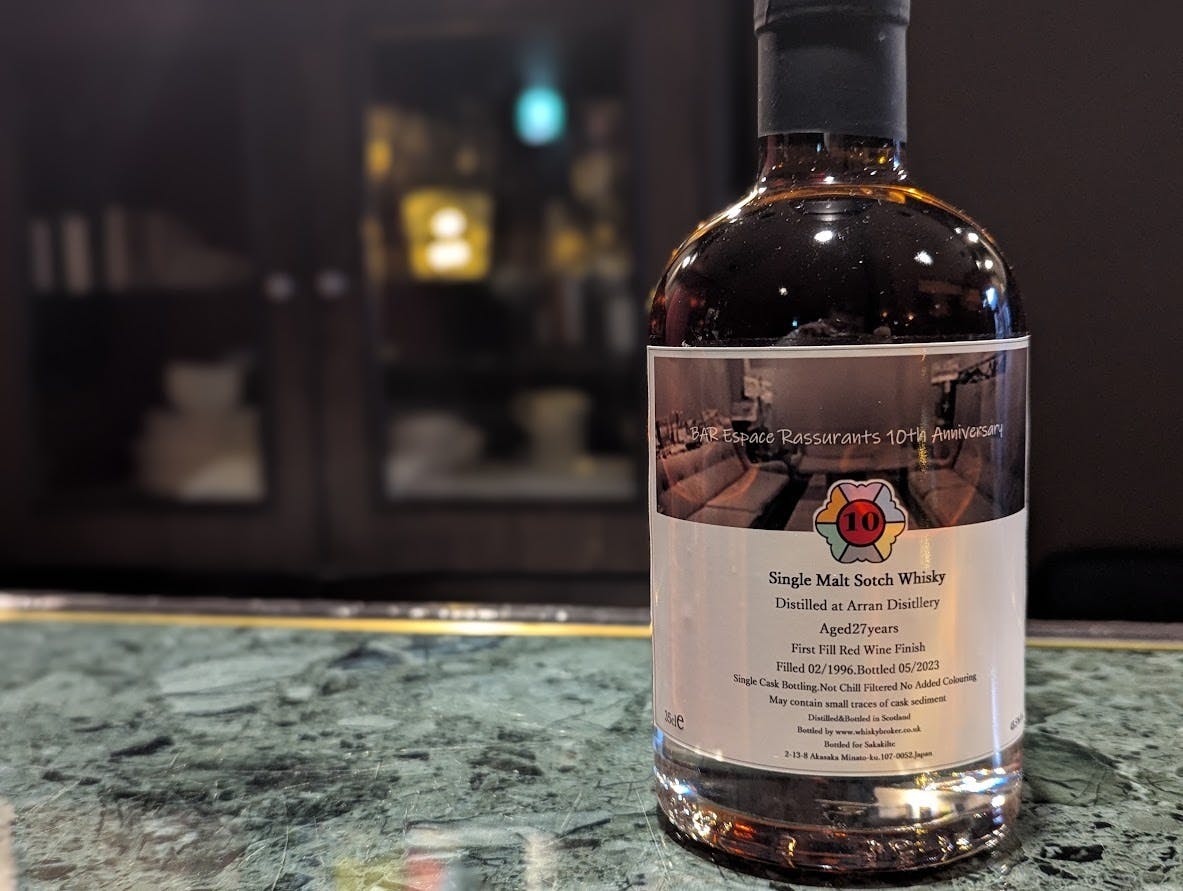 赤坂の名モルトバー、BAR Espace Rassurants様の10周年記念、アラン27年が入荷いたしました。1996年蒸留、2023年ボトリング。こちらは1st fill レッドワインフィニッシュ。赤ワイン樽由来の赤い果実の香りと甘さ、樽由来のタンニン感ではない渋みが心地良い飲み口。余韻に果実が残ります。こちら、ゴールド会員の方は原価クーポン対象となりますので、是非お楽しみくださいませ。【当店提供価格】原価クーポン適用時:10ml 1,500円(ゴールドクラス)30ml:15,000円15ml:7,600円※350mlボトルですので、早期売り切れが想定されます。当店会員様は20%オフでお楽しみいただけます。