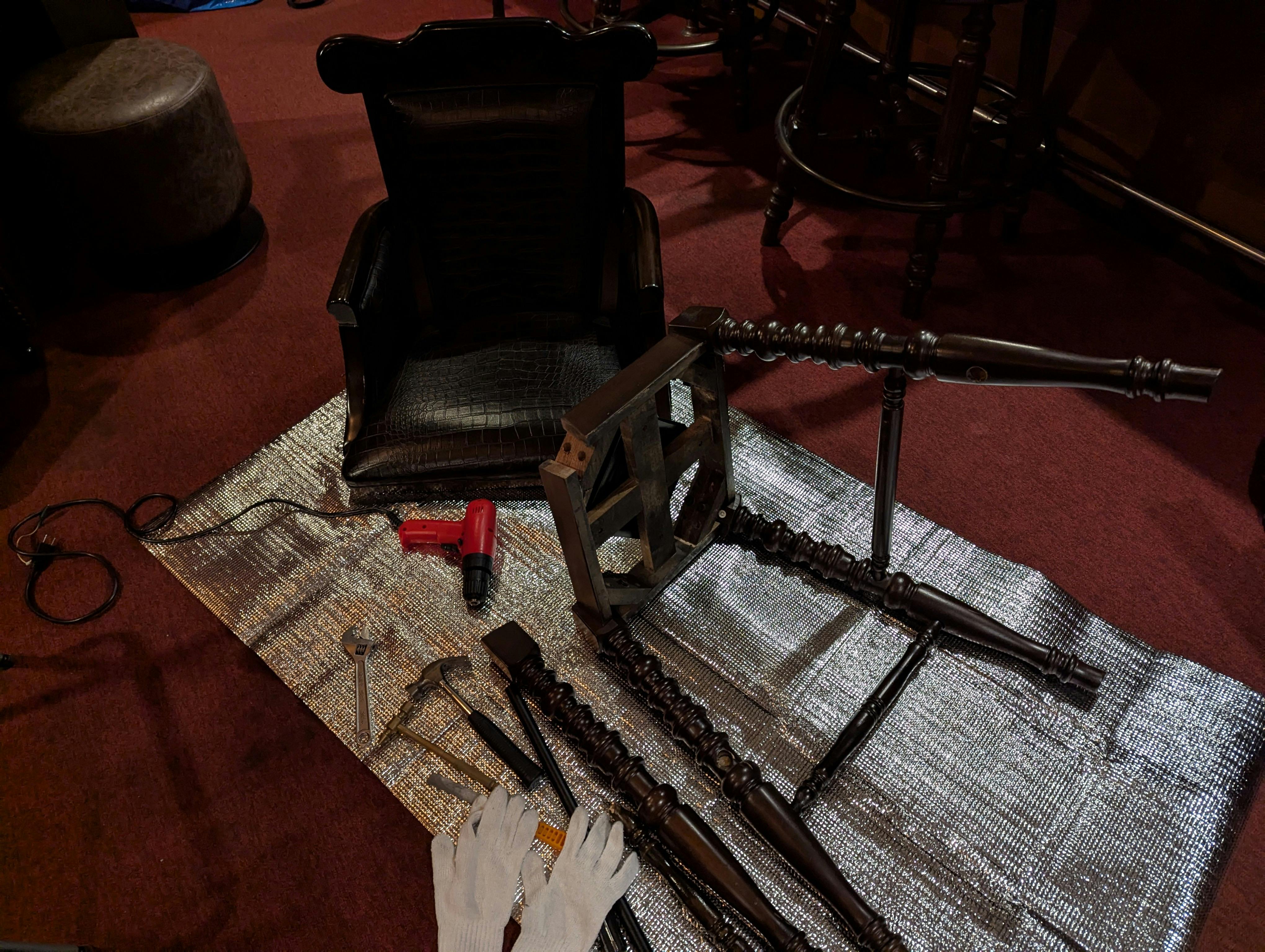 当店のカウンターのチェアはペア二種類で四脚だけです。どちらもレリーフの施された肘付きの旋回チェア。一つのペアは本革、もう一つのペアはクロコダイルの皮で座面が仕上げられています。こちらも長年の使用でガタツキが見られましたので、こちらはDIYで手直しを。小中学生の頃、工作や技術を教わっていて良かったなあ、としみじみ思います!