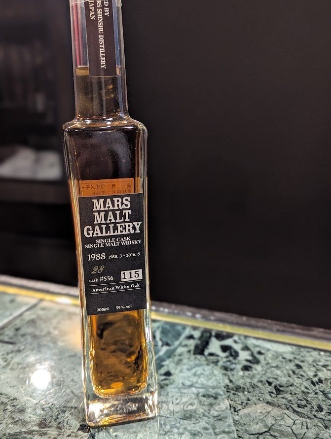 マルス駒ケ岳蒸溜所は1985年に設立されましたが、ウイスキー冬の時代の影響を受け、1992年以降19年間にわたり蒸留を休止。その後、2011年に蒸留を再開し、現在に至る蒸溜所です。個人的には、日本のウイスキー蒸溜所の中で、サントリーやニッカに次ぐ存在だと感じています。本ボトルは、蒸溜所を訪れた際に購入できる「マルスモルトギャラリー」シリーズの一本。1988年に蒸留され、アメリカンホワイトオーク樽で熟成ののち、2016年8月にボトリングされた28年熟成のウイスキーです。製造休止前の原酒を使用した商品が今後発売されるかは不透明ですが、ウイスキーは「時間を飲むお酒」。昭和63年3月に蒸留され、昭和・平成・令和と三つの時代を樽とボトルの中で過ごした佳酒を、ぜひご堪能ください。※本品そのものは二次流通品ですが、当店は蒸溜所で購入した同商品の別シリアルナンバー(150番)をストックしており、シュリンクおよび封印の状態並びに色から完品であると判断しています。提供前には状態を比較確認のうえ、別ストック(150番)のみの提供とさせて頂く場合がございます。【当店提供価格】原価提供クーポン利用時:10ml:1,700円(プラチナクラス)一般提供価格:30ml:13,900円(ハーフ可)
