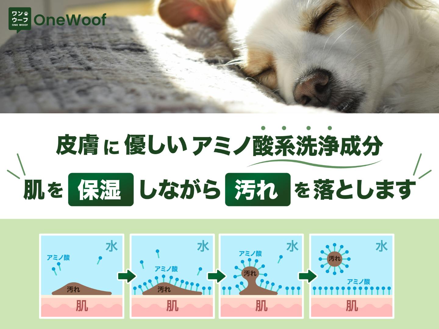 アミノ酸は、皮膚にやさしい成分として知られており、愛犬のデリケートな肌をしっかりとケアします。強い洗浄成分を含まず低刺激で、皮膚のバリア機能をサポートしながら、優しく洗い上げるので、乾燥やかゆみが気になるワンちゃんにも安心です。