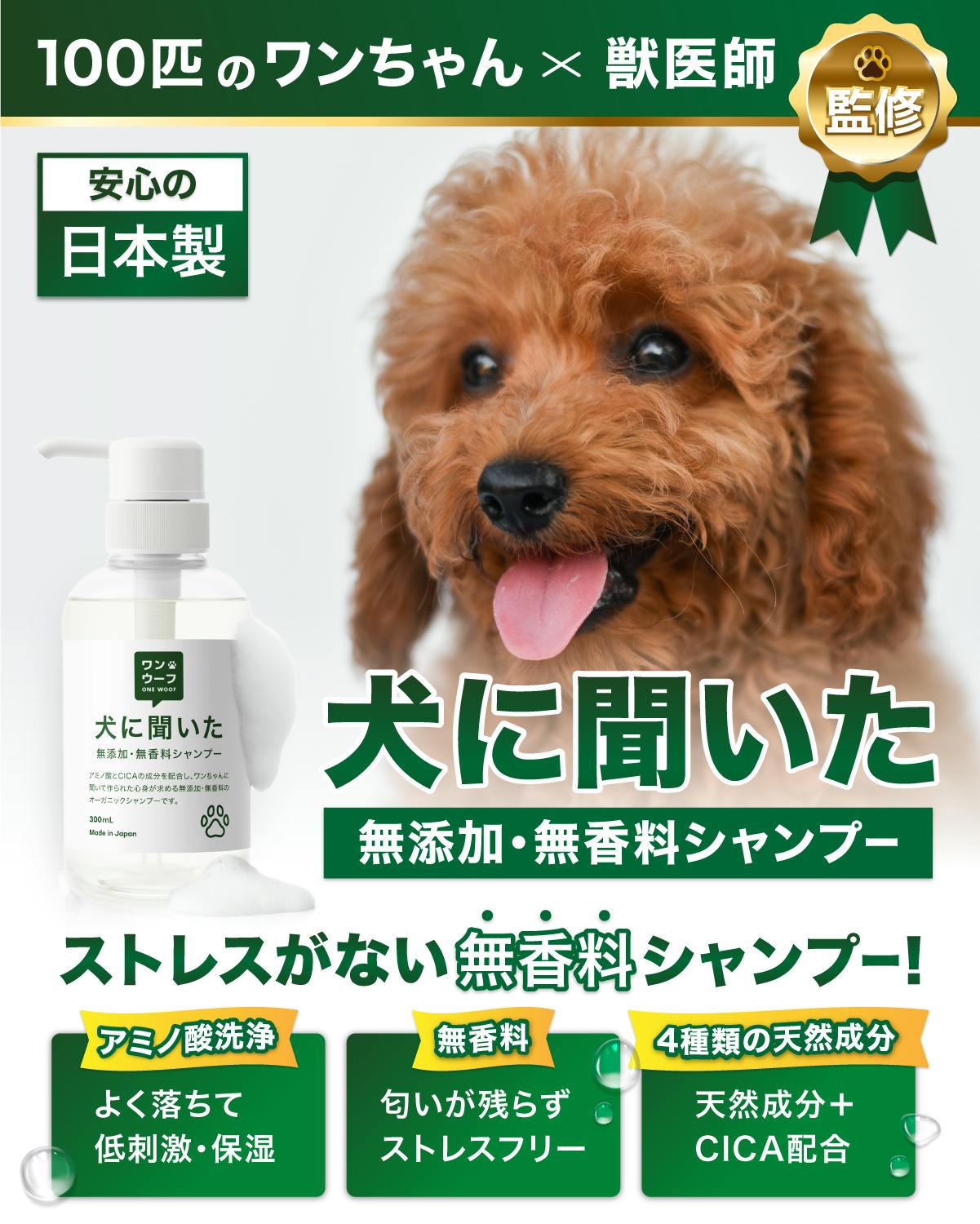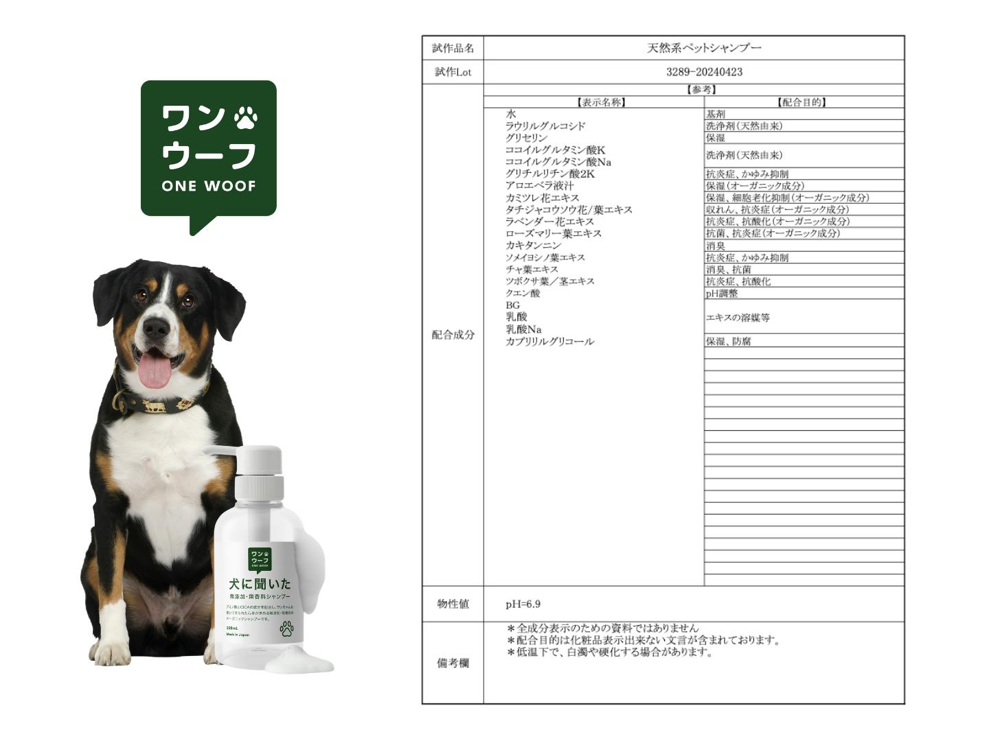今回、皆様にご体験いただきたいのが初めての自社商品である「OneWoofの犬に聞いた無添加・無香料シャンプー」です。