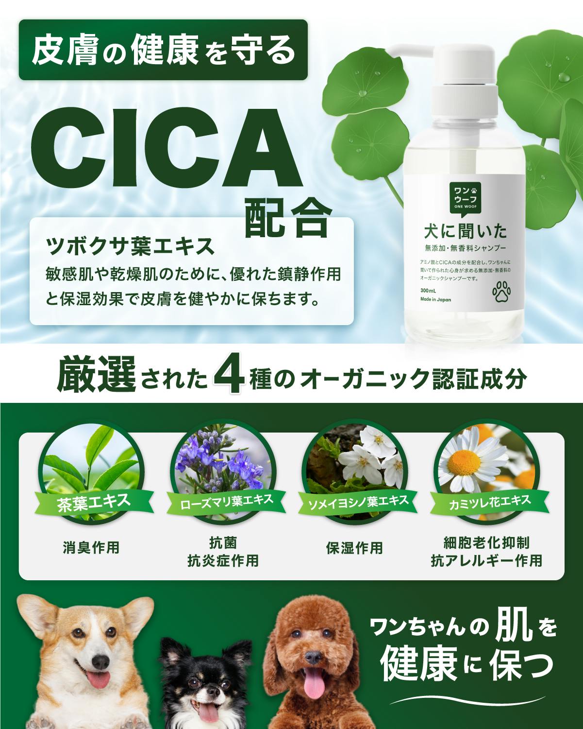 CICA(ツボクサエキス)配合の犬用シャンプーは、愛犬のデリケートな皮膚にやさしく、保湿をサポートする植物由来成分で安心して使えるのが特徴です。被毛をふんわりと仕上げ、毎日のケアに適した処方で、清潔で健やかな状態を保ちます!
