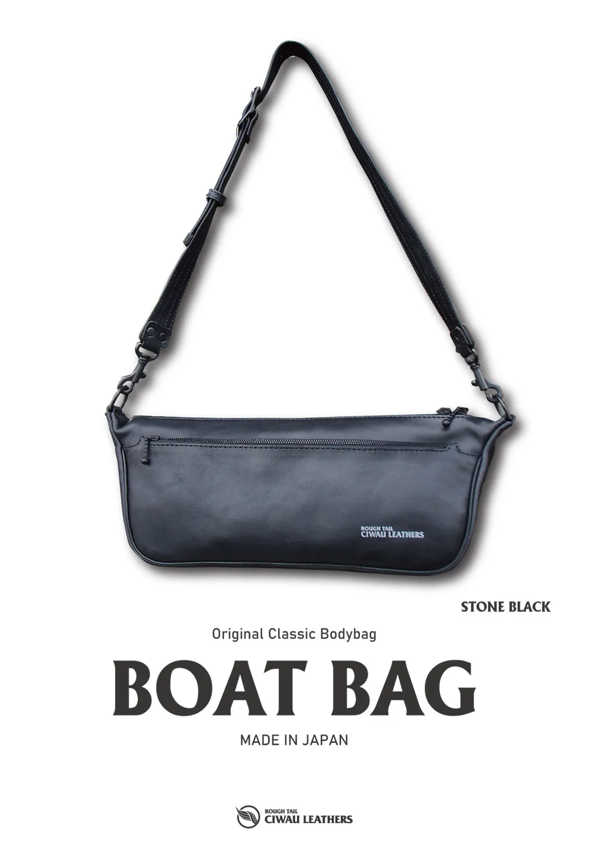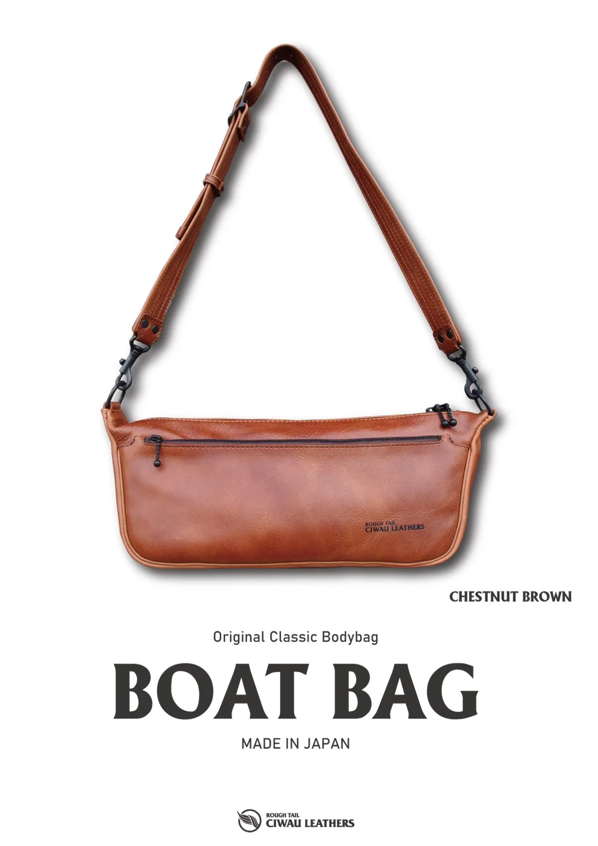 厳しい使用環境で使用される製品を作ってきた貴重な経験は、サイドバッグ以外にもさまざまな革小物の製作に生かされています。そこに独自のファッション性を加味した【ラフテールクオリティ】を、普段の生活の中でお楽しみいただけるのが【チワウレザース】なのです。そして、さまざまシーンで使っていただけるボディバッグ、チワウレザース「ボートバッグ」が誕生しました。