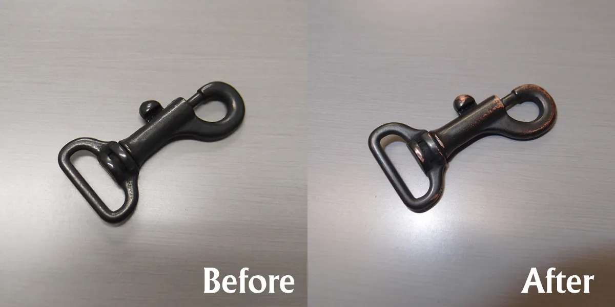 ダール加工の特徴として、使用状況によりメッキが削れ独特の色味(銅色)が顔を見せます。使い込むほどに表情を変える経年変化が楽しめる加工です。