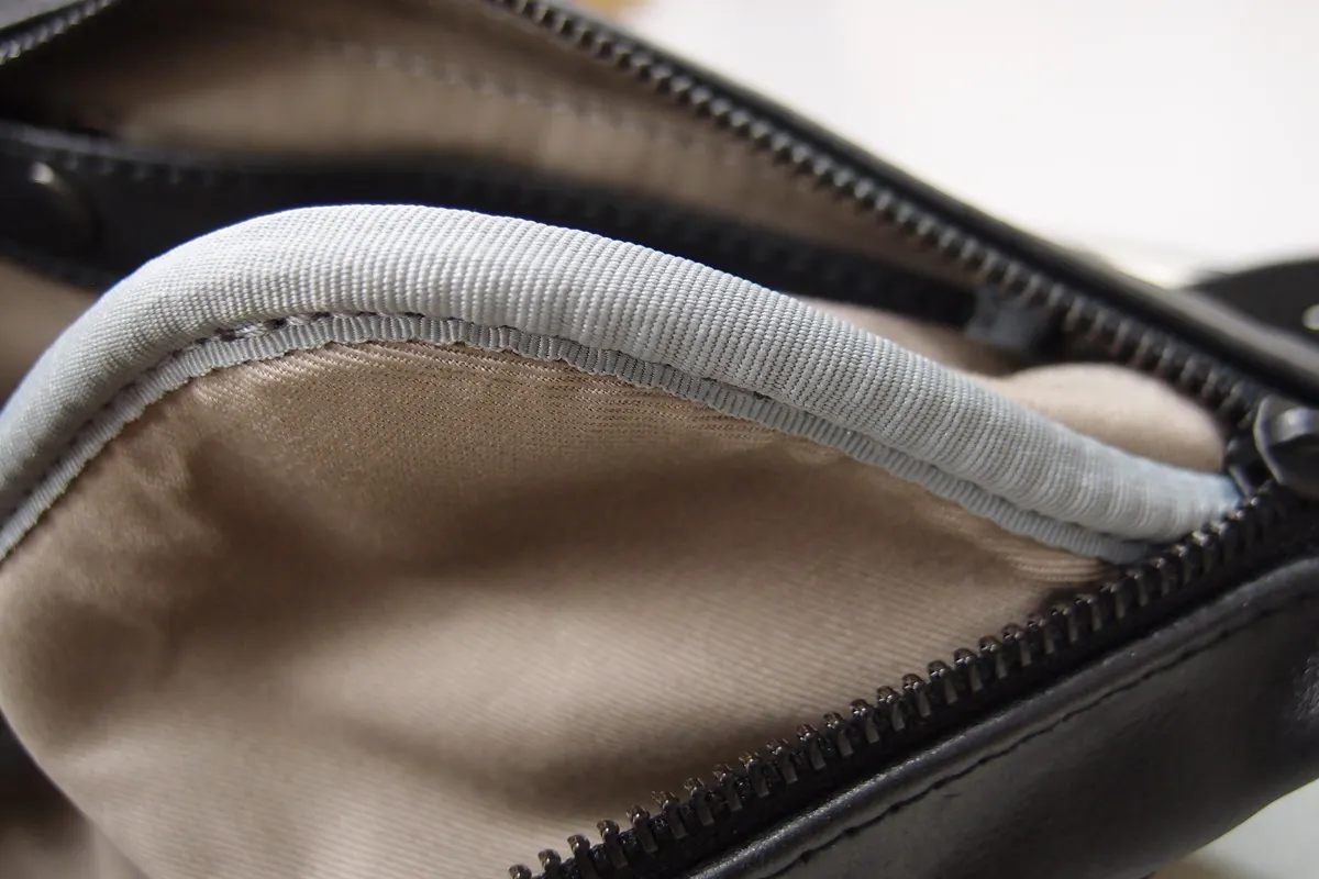 収納物が縫製部分に当たり、糸のほつれの原因になります。ほつれを防ぐためバインダー処理を施します。