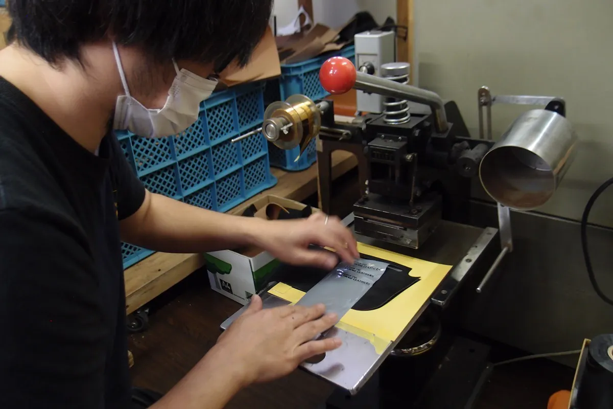 刻印に熱をかけながらカラーフィルムを革に圧着させます。一見簡単そうに見えますが温度設定や力加減が難しく、やり直しの効かない作業の一つです。