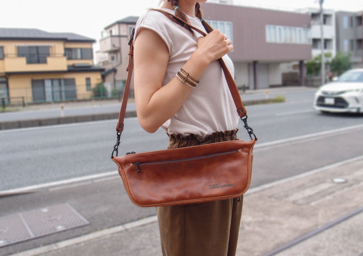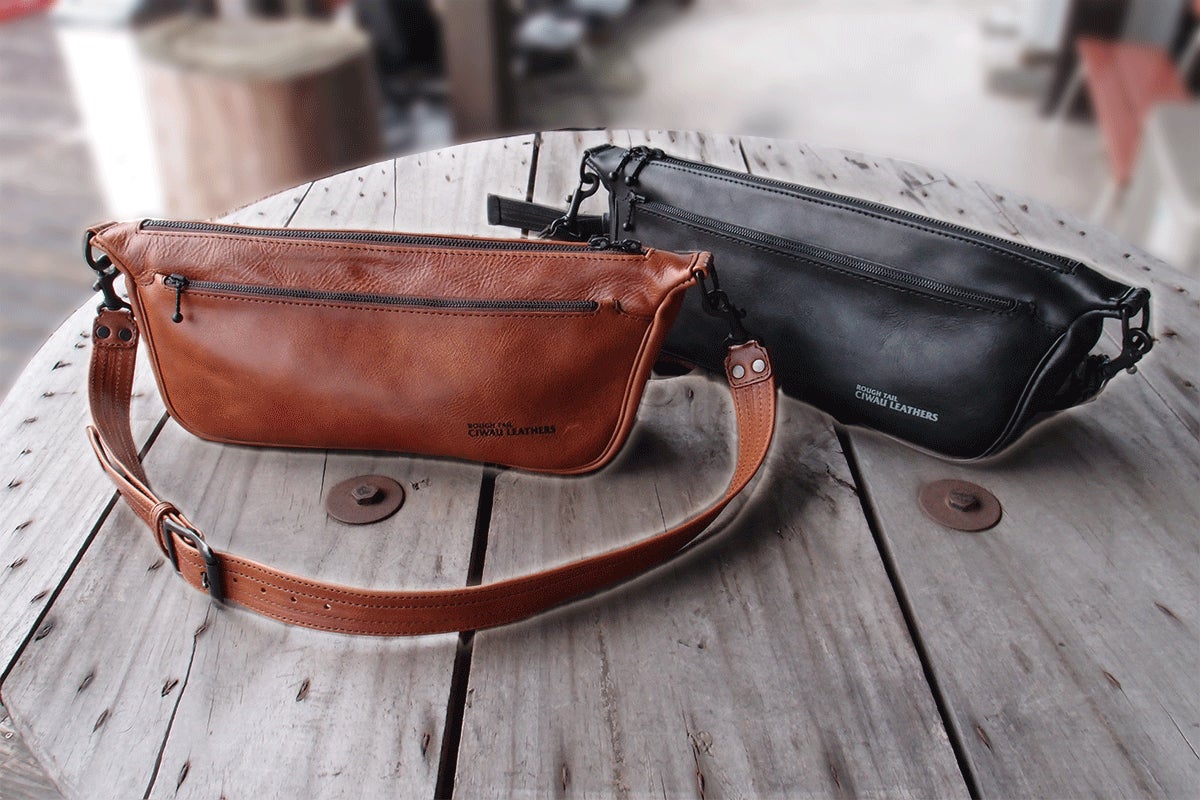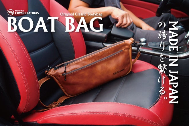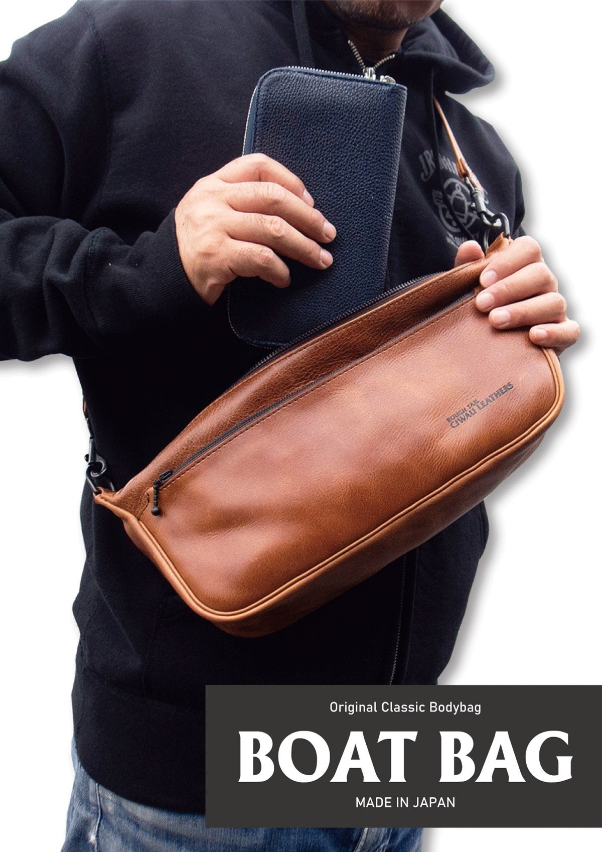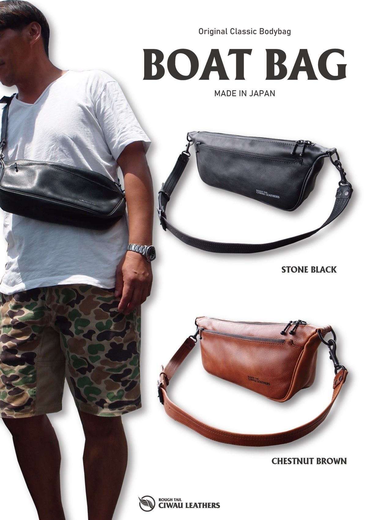 厳しい使用環境で使用される製品を作ってきた貴重な経験は、サイドバッグ以外にもさまざまな革小物の製作に生かされています。そこに独自のファッション性を加味した【ラフテールクオリティ】を、普段の生活の中でお楽しみいただけるのが【チワウレザース】なのです。そして、さまざまシーンで使っていただけるボディバッグ、チワウレザース「ボートバッグ」が誕生しました。