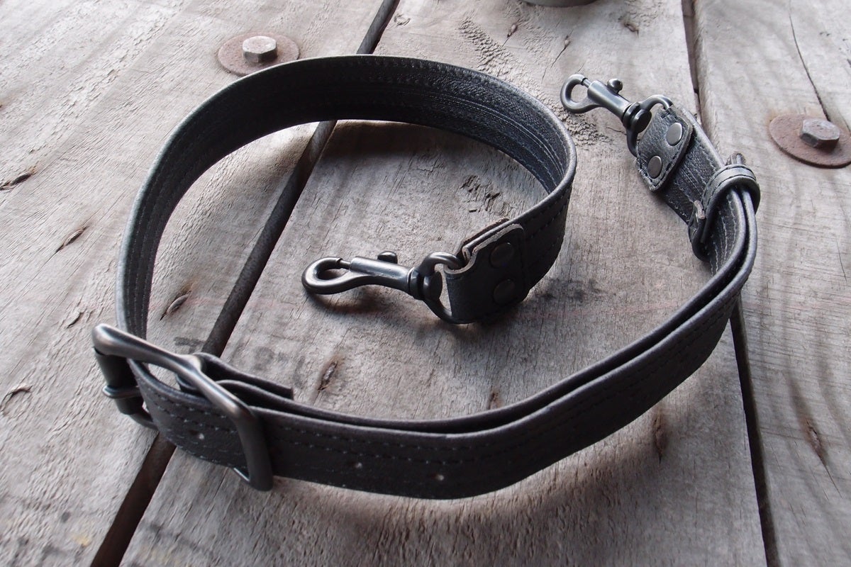 ショルダーベルトも両面本革製。幅は3cm、長さは76~100cmの間で調整ができます。