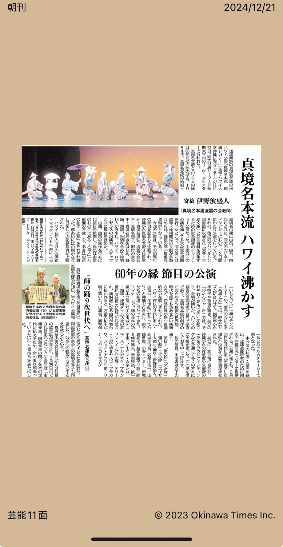 2024/12/26 18:29ALOHA! 真境名本流、山崎啓貴です。ハワイ公演から1ヶ月経ちました。家元のお姿とお言葉も鮮明に脳裏によぎります、昨日のことのようです。12/21に沖縄タイムスの新聞に本番の様子が掲載されました。※返礼品についてパンフレットのみの返礼品で支援をいただきました方々、12/15ごろに郵送しておりました。ご報告が遅くなりました。次回の返礼品の準備をまた報告します。動画配信やTシャツの方々、予定は2月となっておりますが1月にでも間に合わせられるか、挑戦中です。今しばらくお待ちくださいませ。 もっと見る
