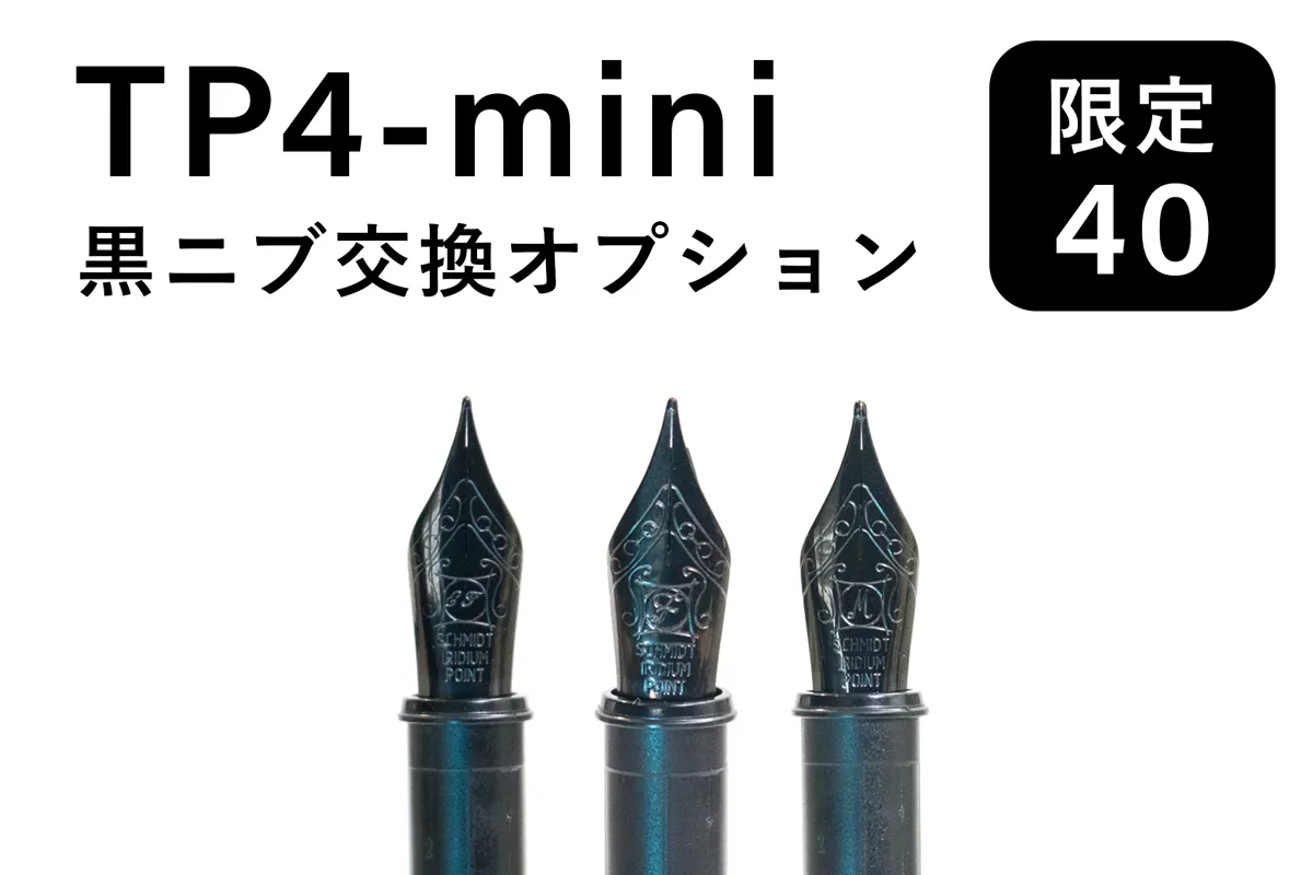 | 急遽追加しました!【黒ニブ交換オプション】 TP4-miniで標準装備されているニブ(ペン先)を黒ニブに交換するオプションです。 TP4-mini ブラックを支援された方限定のオプションです。 ※こちらのリターンを支援の場合は、標準装備の金ニブは付属しません。 |