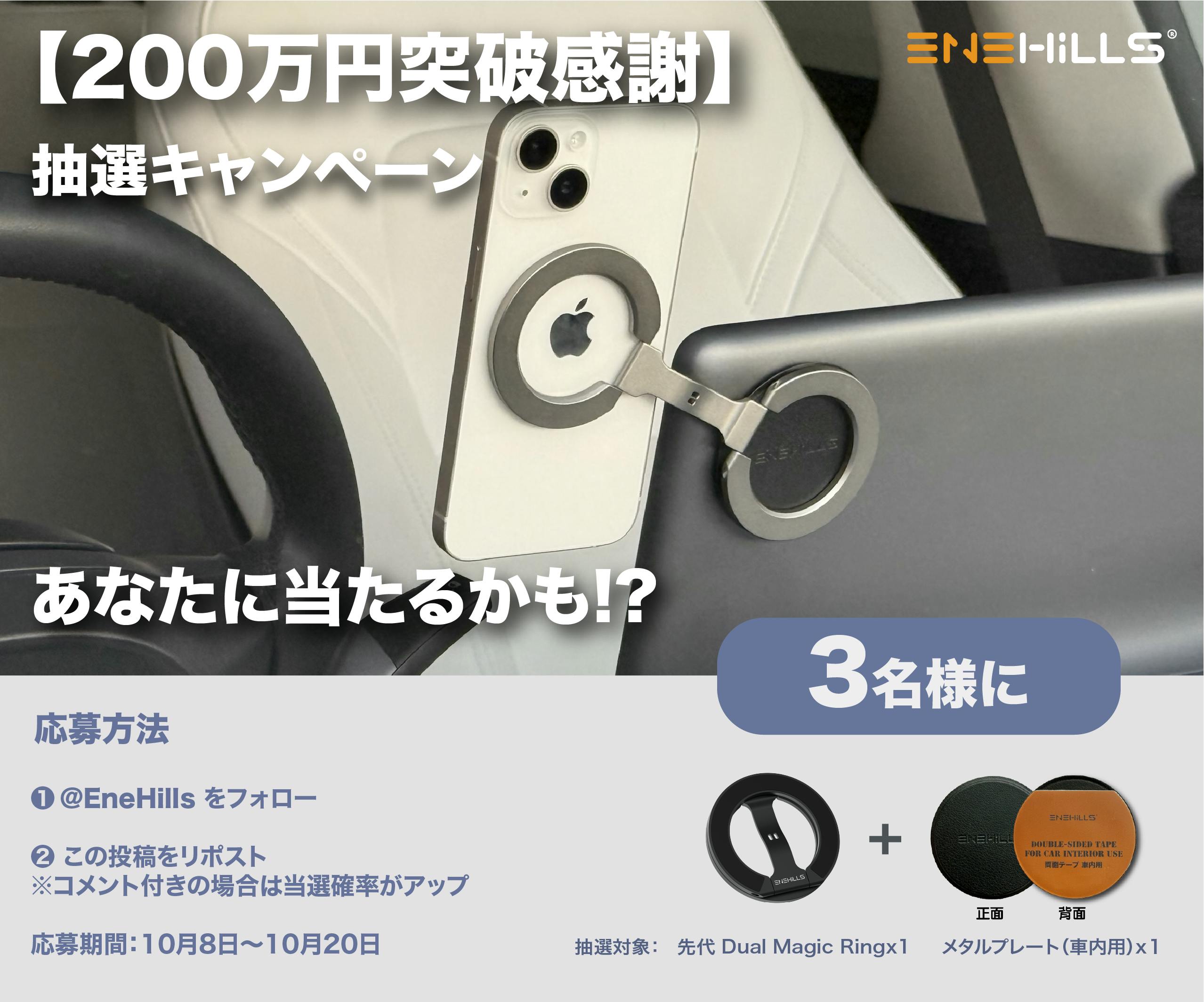 2025/10/09 12:36ご支援者様いつも大変お世話になっております。これまでに温かいご支援、誠にありがとうございました♥このたび、新型Dual Magic Ring(Rev版)200万円突破を記念して、抽選キャンペーンを開催中です!X(旧Twitter)にて、抽選で<3名様>に大人気の先代モデルとメタルプレート(車内用)をプレゼント!【応募方法】① @EneHills をフォロー② 対象投稿をリポスト(引用で当選率UP)【応募期間】10/8〜10/20※すでにフォローしている方もご応募いただけます!▼詳しくはこちらhttps://x.com/EneHills/status/1975912215980179675たくさんのご応募を心よりお待ちしております! もっと見る