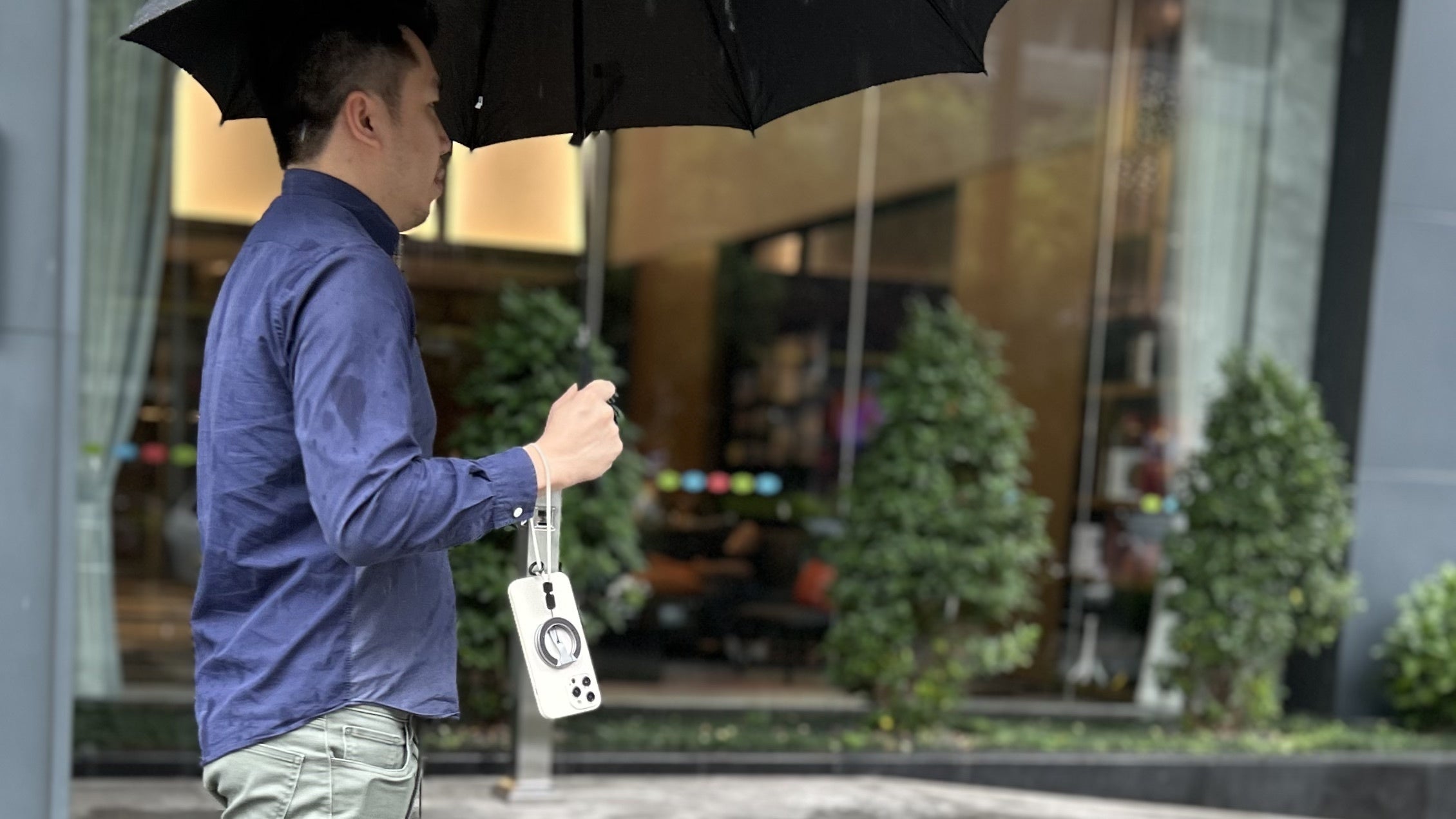 雨の日には、傘を支える時、手が塞がっていても、スマートフォンを手首にかけることで邪魔になりません。