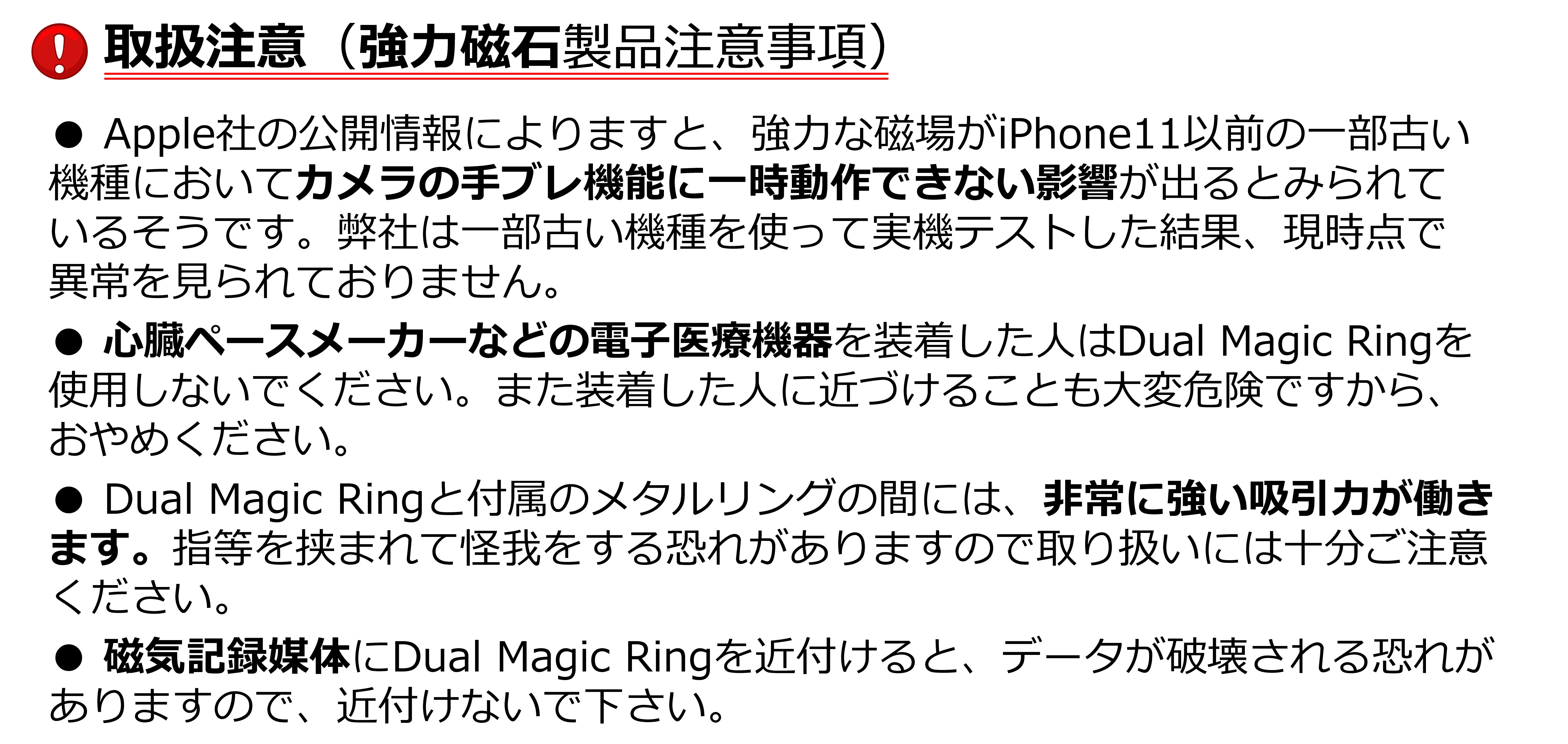Dual Magic Ringを使用することによってカメラ機能に不具合が生じた場合でも、弊社は責任を負いかねますこと、十分ご理解いただくようお願い申し上げます。