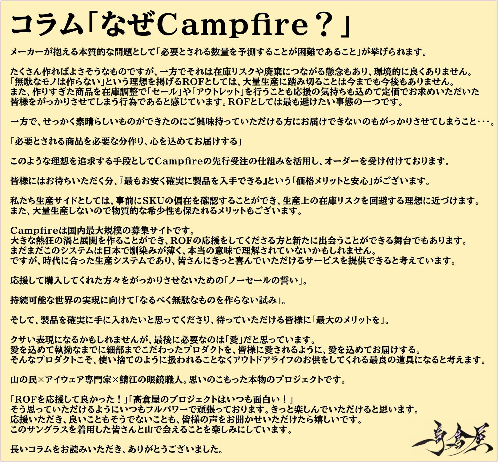 プロジェクトは皆様と共創するものであり、単なる資金調達やお買い物を超えた体験価値を提供するものと考えています。ROFと髙倉屋が届けたいのは山と旅を通して得た発見であり、視点であり、考え方であり、メッセージです。そのメッセージの乗り物が企画や製品であるというご理解をいただけると幸いです。
