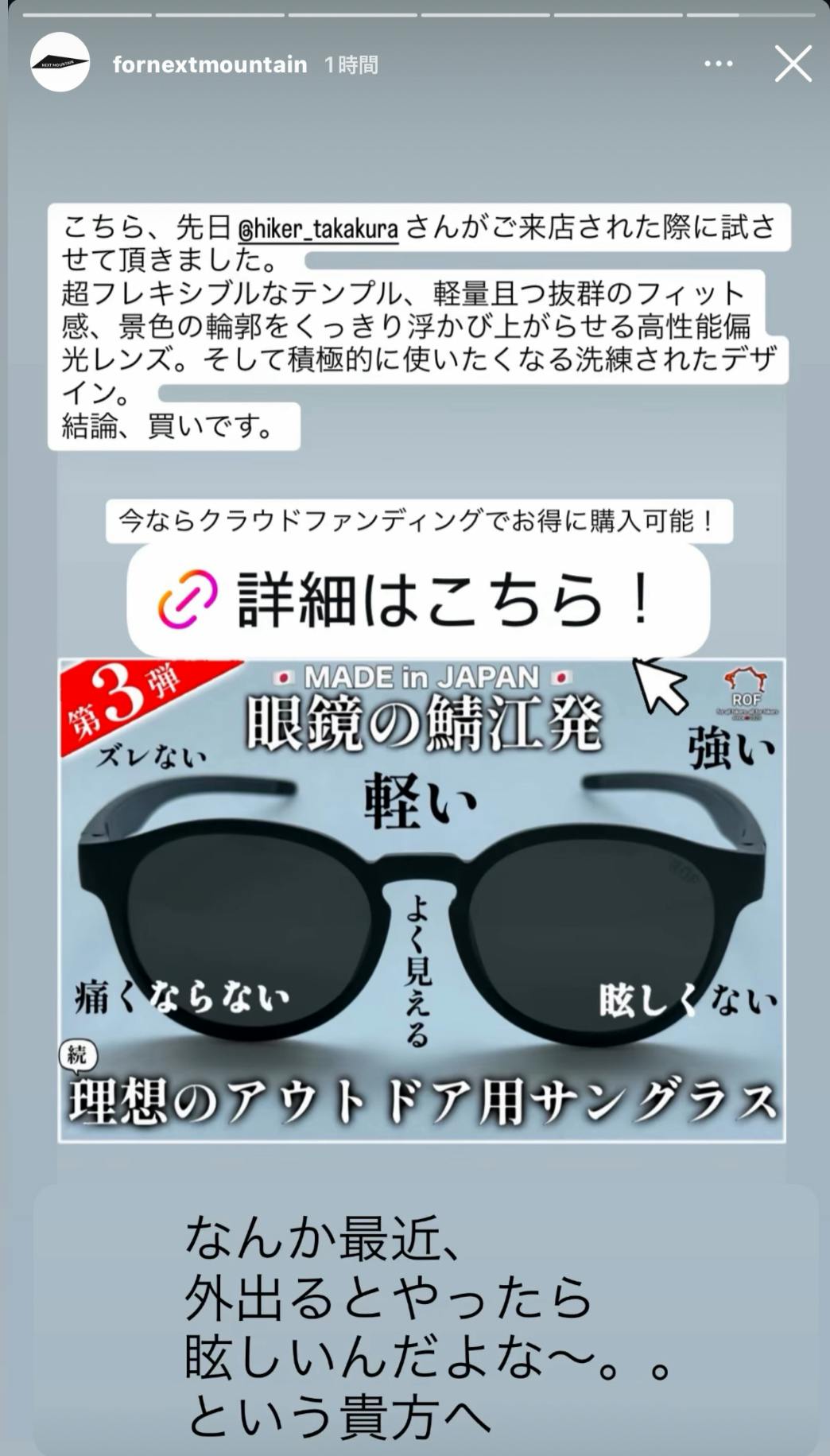 ROFのサングラスストーリーは、山と旅の実践者である髙倉屋がアウトドアを楽しむ中で高品質なサングラスを着想→開発→製造→流通させています。大きく「Daily/Hike」「LongTrail」「Mountain」「Extreme/Glacier」と4つのカテゴリへ進化し、度付きの展開や「Night Drive」(登山者は深夜早朝の運転も多いため)など網羅していく長期的な物語です。山の民による山の民のためのサングラス屋を本気で目指しています。応援どうぞよろしくお願い致します!