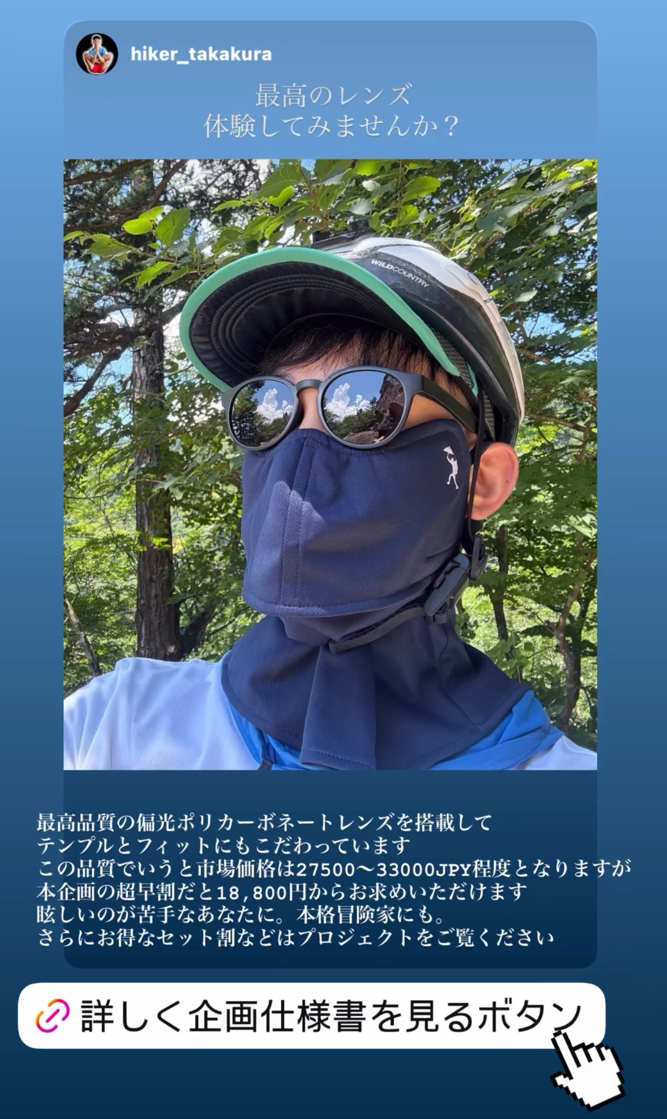 今後の展開に繋がる大切な企画となっています。先行受注による超早割は最もお得にゲットできる機会となっておりますので、山仲間やアウトドア友達に本プロダクトをシェアしていただけますと幸いです。