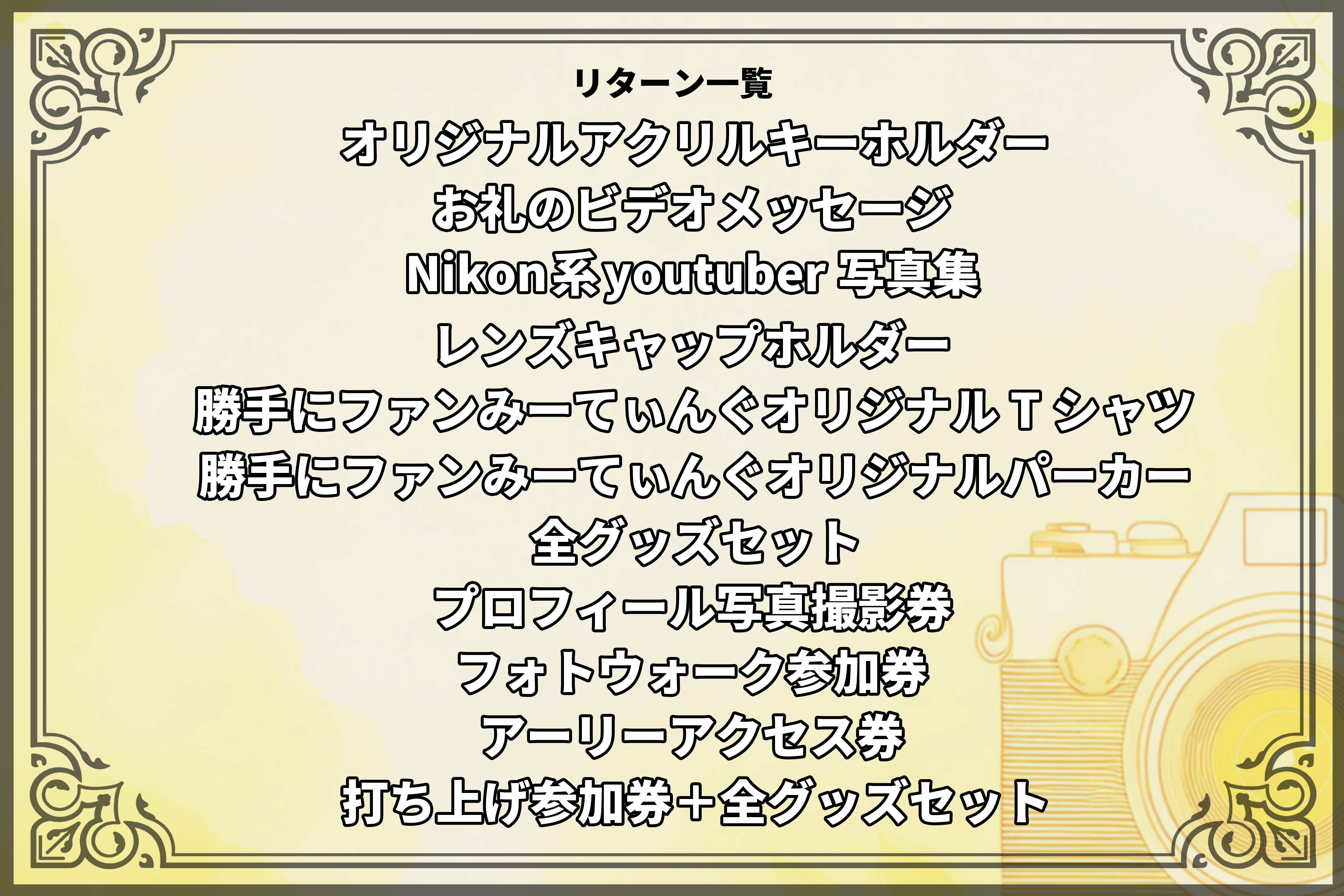 Nikon系Youtuber夢のオムニバス写真集やオリジナルグッズ!そして当日皆さんが一緒に楽しく盛り上がれるような様々なリターンを用意しました。