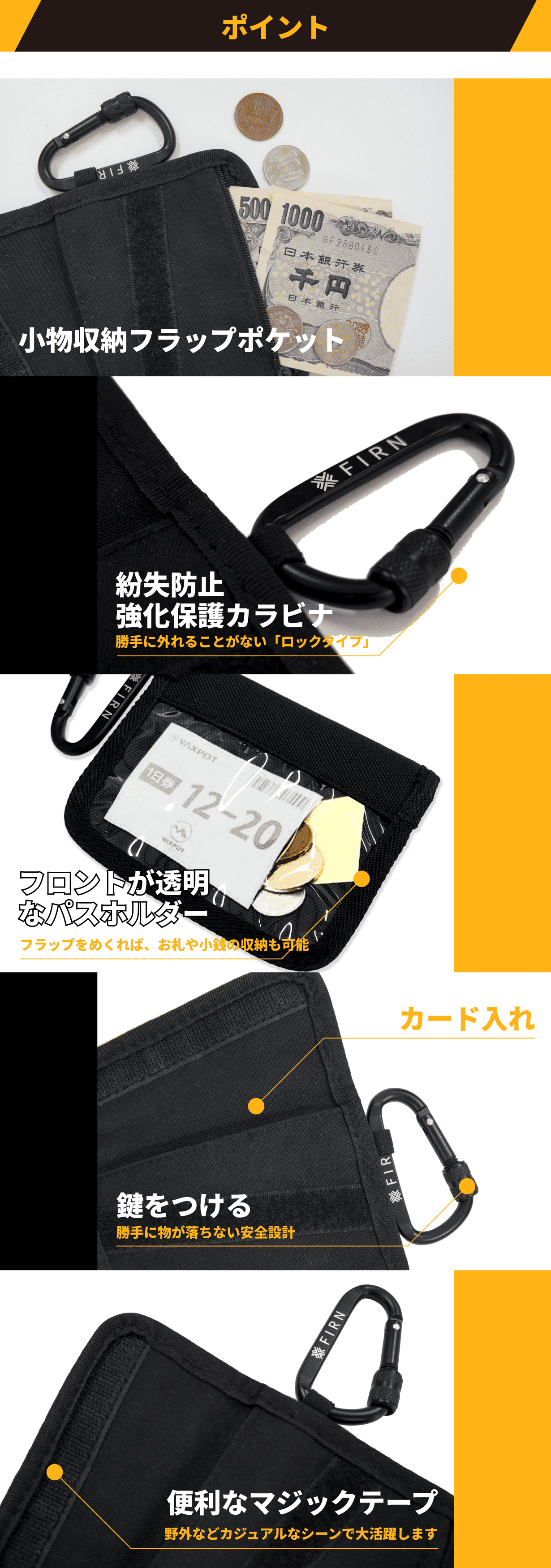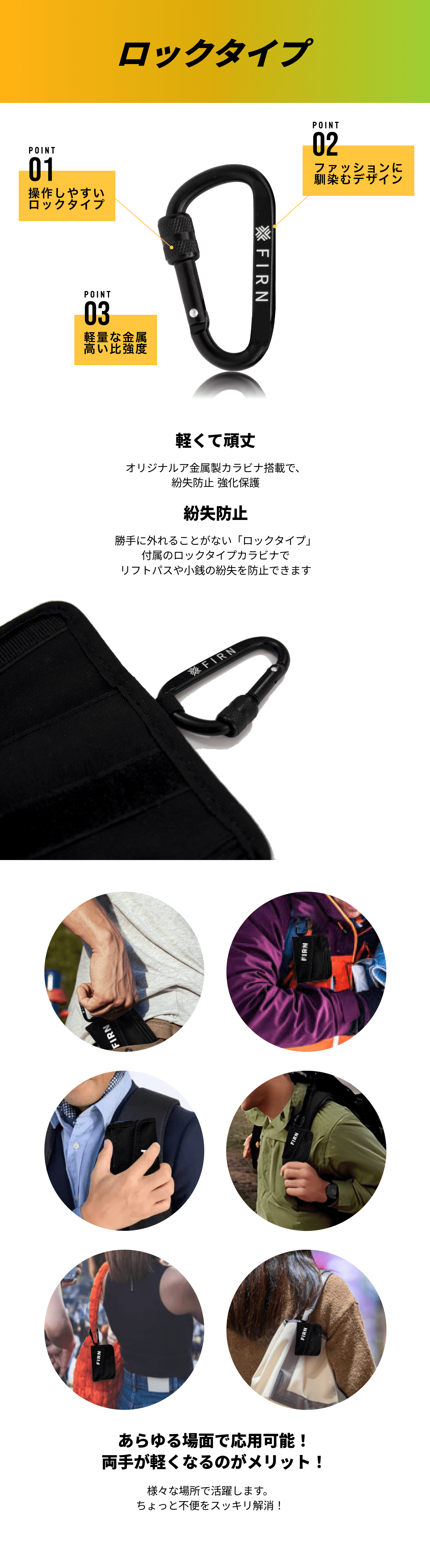 FIRNのカラビナはロックタイプになっており、勝手に物が落ちない設計です。
