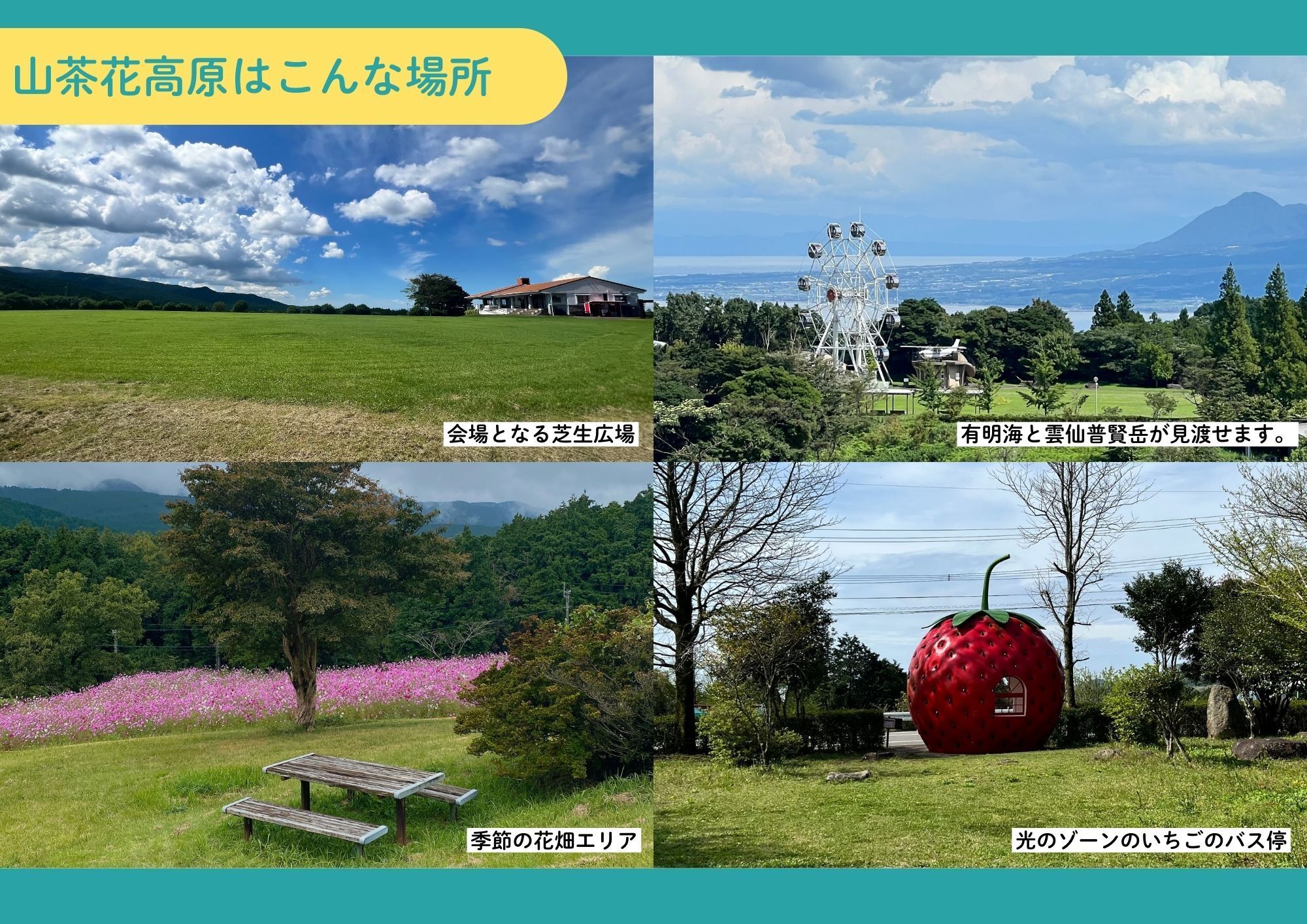 会場となる山茶花高原は、多良岳の中腹標高約450mに位置し、麓の小長井町や有明海、雲仙普賢岳まで見渡せる、風光明媚な施設となっております。