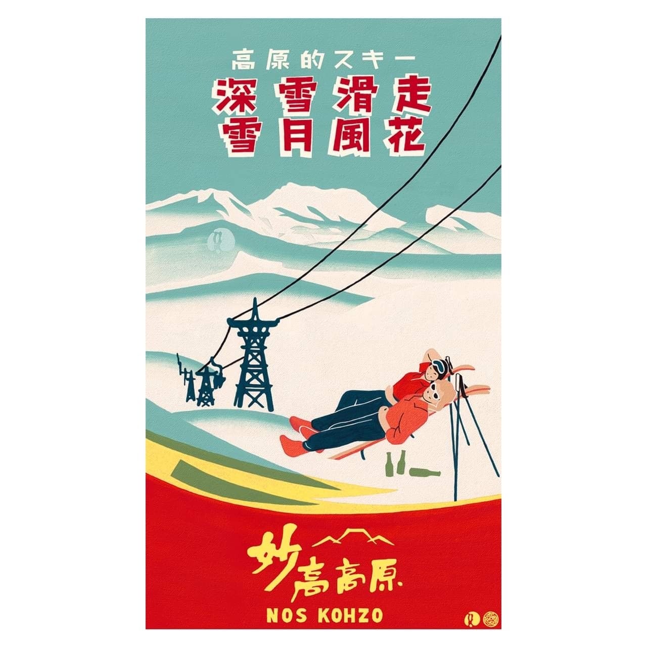 ・リラックスする女性をアクセントに妙高のシンボル的存在の妙高山や日本で初めての運輸省第一免許リフ トを描いた“flor”