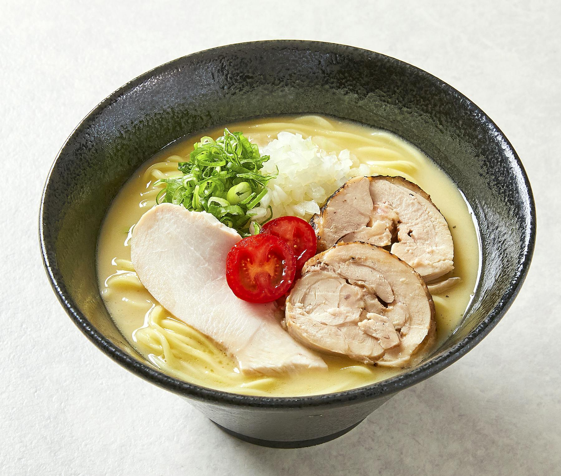 チャーシューは低温調理した鶏もも、鶏むねの2種類が楽しめます。 プチトマトは塩、にんにく、メープルシロップでマリネしており味のアクセントになっています。