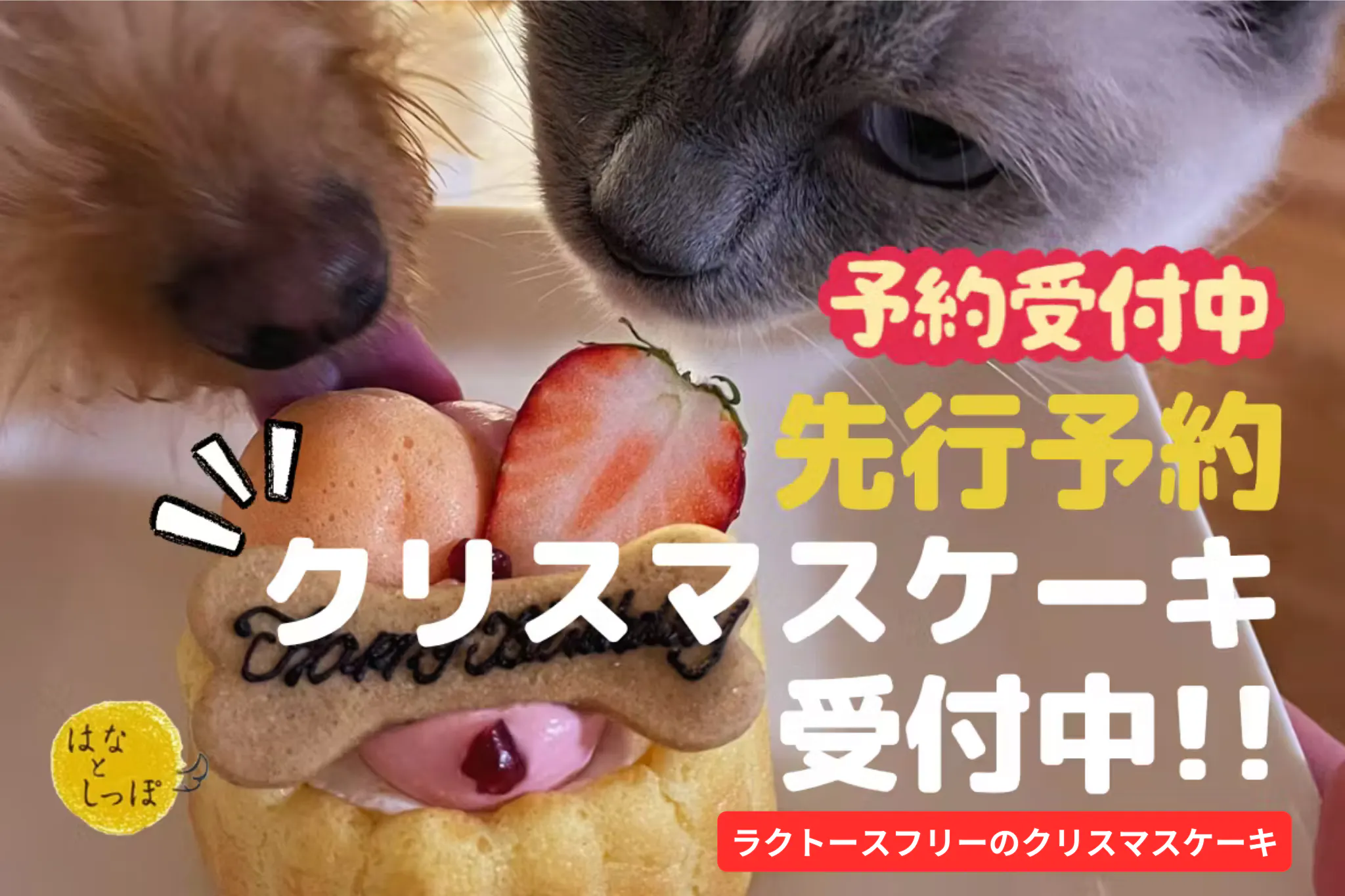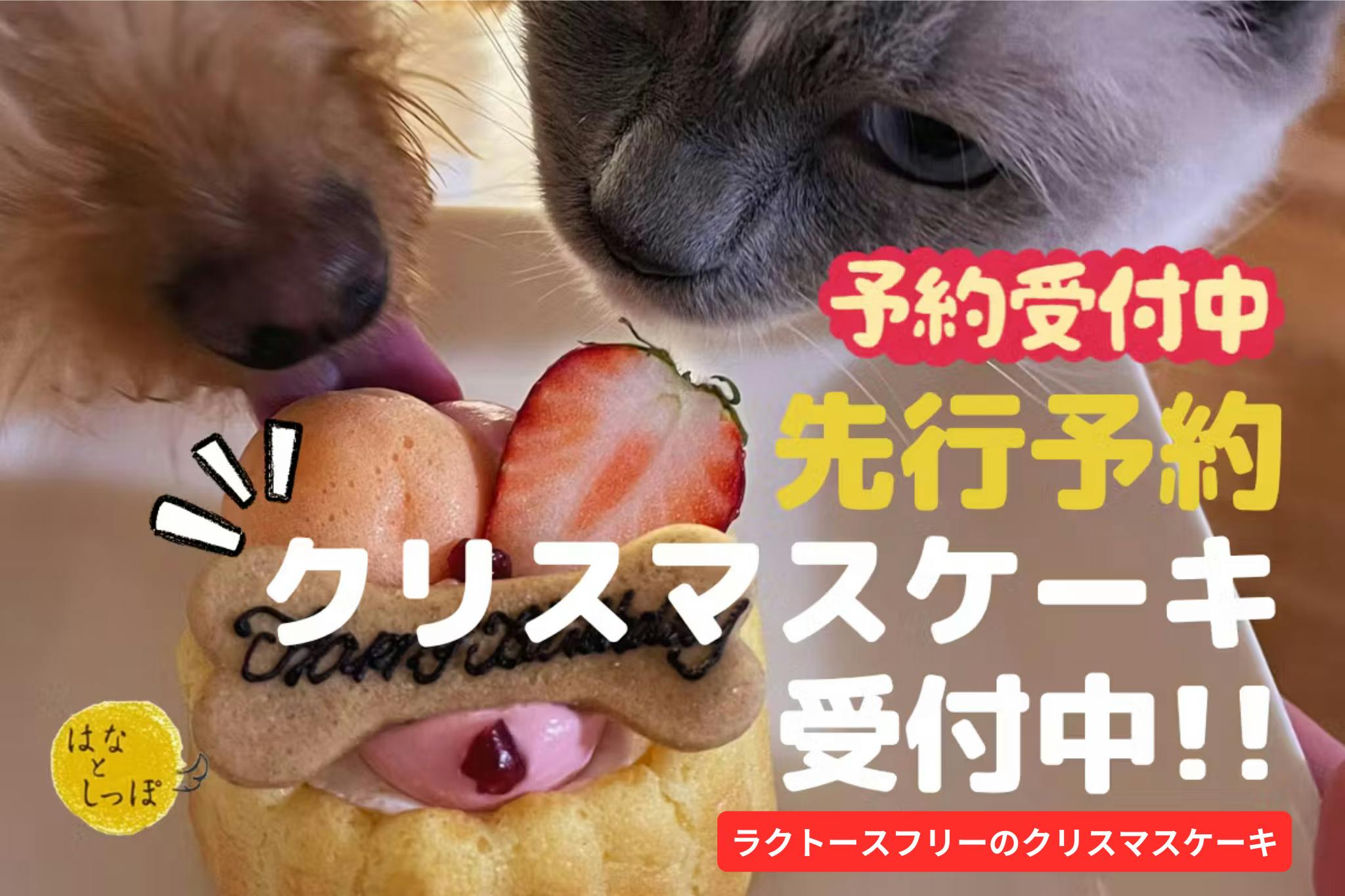 →「はなとしっぽ」2024年クリスマスケーキの先行予約(ホールケーキ 1個、およびバリューパック)をご提供させていただきます。ケーキはすべてラクトース(乳糖)フリーの犬猫用ケーキです。