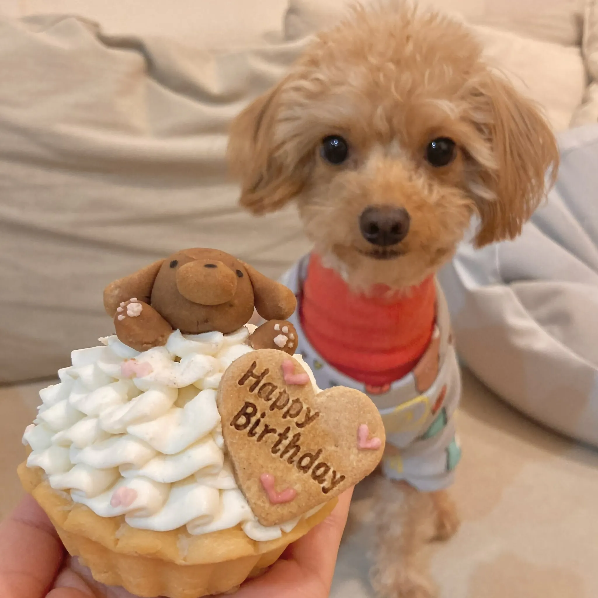 ペット食育士とパティシエが「それならヨーグルトクリームを使用したケーキを作れば良い。人間のケーキでもヨーグルトクリームを使ったケーキは普通にあってとても美味しいよ。」「それにヨーグルトは整腸作用があって腸内環境を改善する働きもあるから犬や猫の健康にも良い働きをする優れた食材だと思う。」ということで、愛犬の初めての誕生日ケーキは、ヨーグルトクリームをベースにしたケーキでお祝いしました。