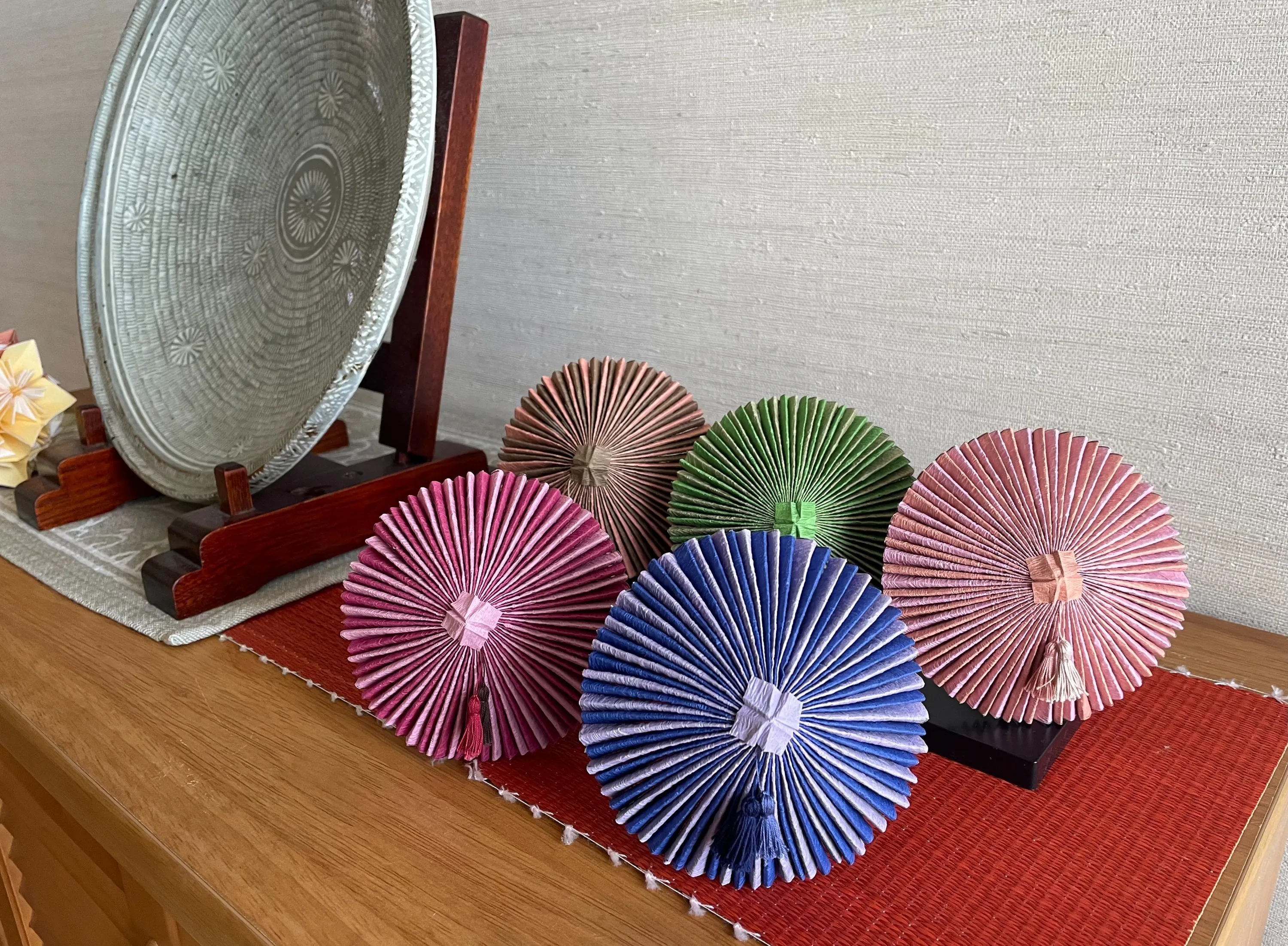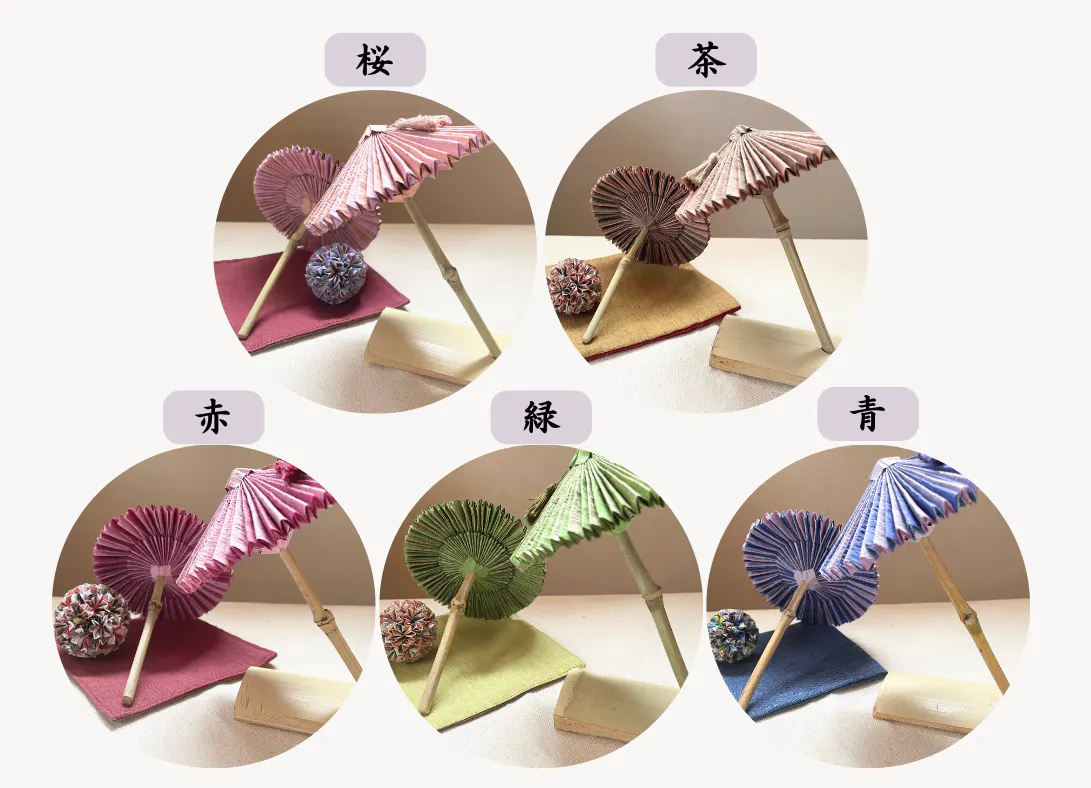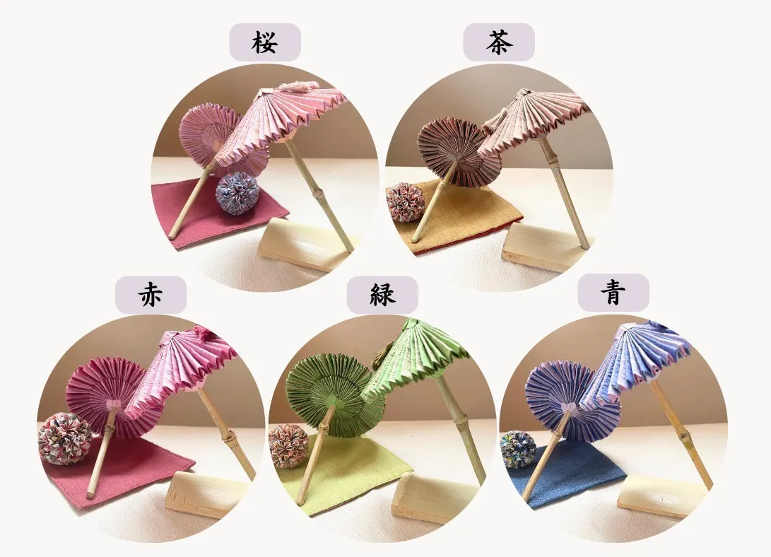 ものづくりや日本の和文化に興味があり、趣味から始まった置物の和傘作りでしたが、型の開発、形や配色、糸じめ作業と段階ごとに改良を重ね満足いく形となり、今現在に至ります。