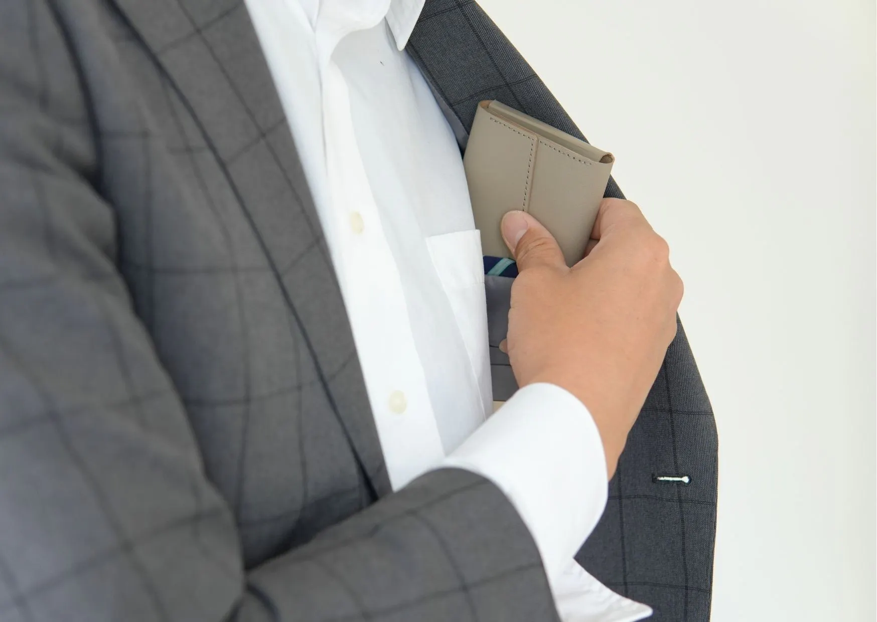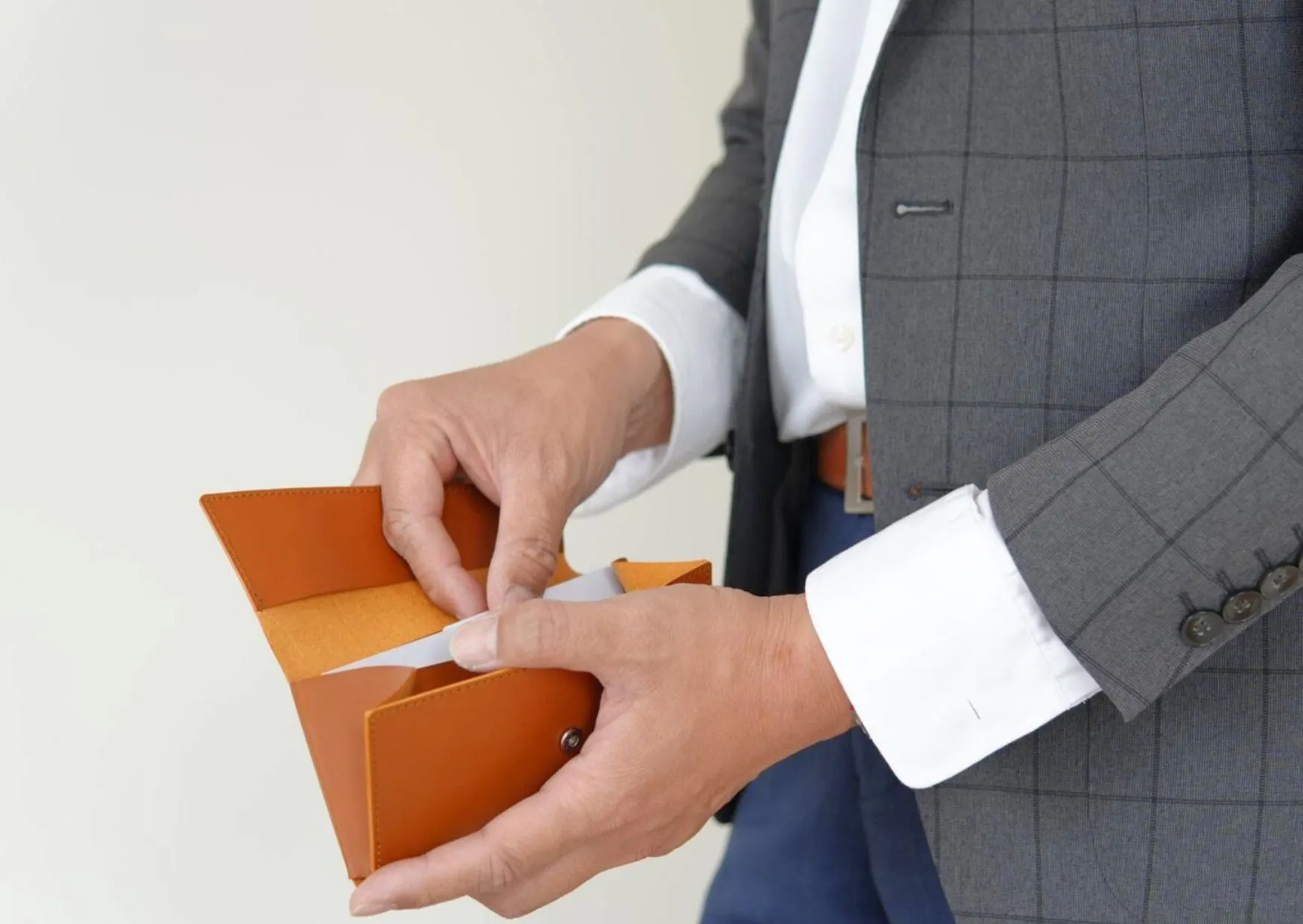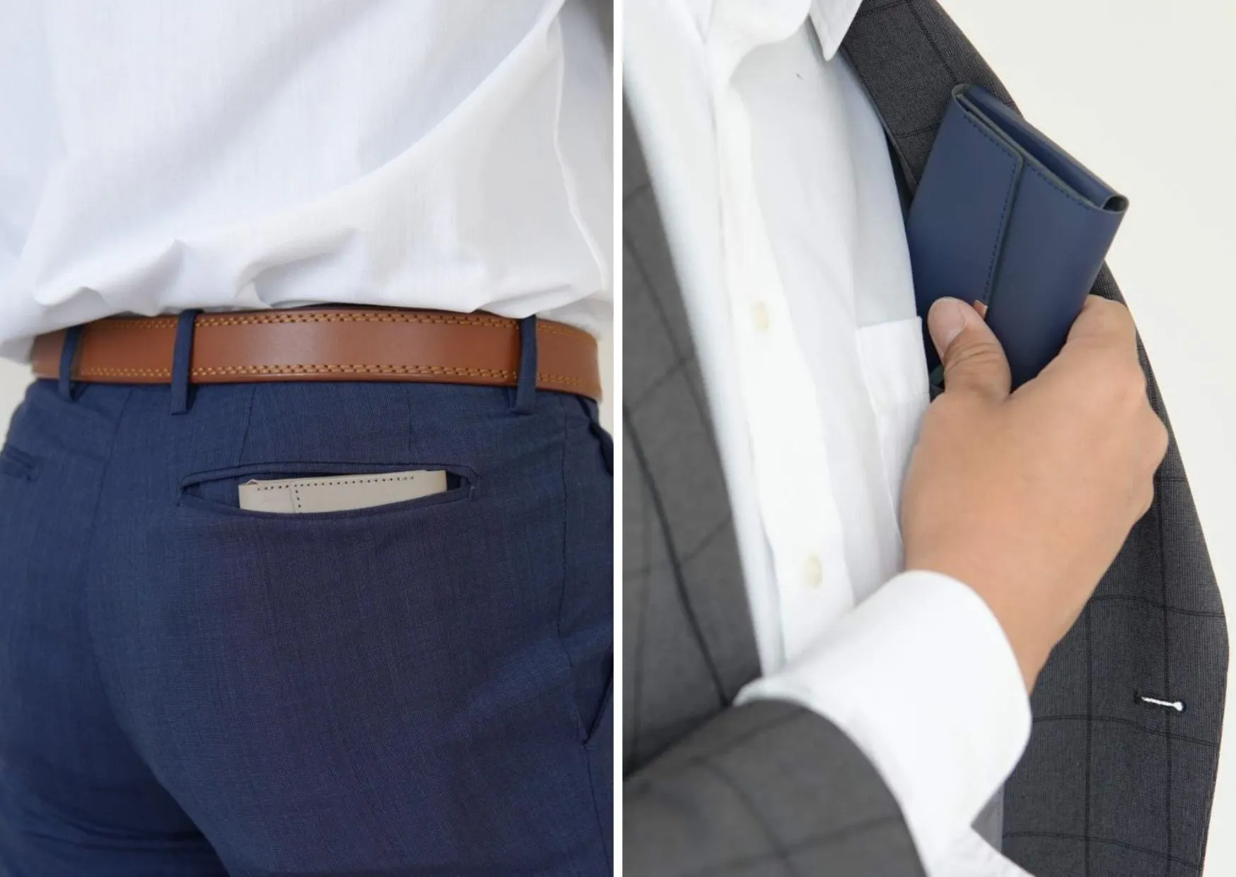 コインとカードが重なりにくい構造を採用したことで推奨量を入れても厚みはわずか約2cm。おしりのポケットへの収まりは抜群!もちろんジャケットの内ポケットにも入ります。